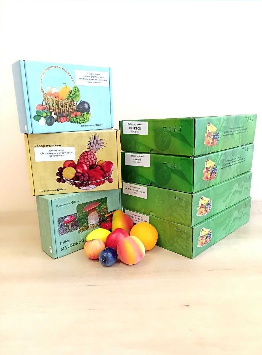 6) Набор муляжей "Корнеплоды и плоды". Набор содержит 26 муляжей: Картофель; Свекла; Морковь; Помидор «Плановый»; Помидор «Маяк»; Помидор «Рыбка»; Огурец «Неросимый»; Огурец ВИР-505; Редька; Баклажан; Перец красный; Редис; Репа; Яблоко «Апорт»; Яблоко «Кандиль синап»; Яблоко «Пепин шафранный»; Груша; Лимон; Апельсин; Персик; Абрикос; Клубника; Вишня; Хурма; Мандарин; Слива.