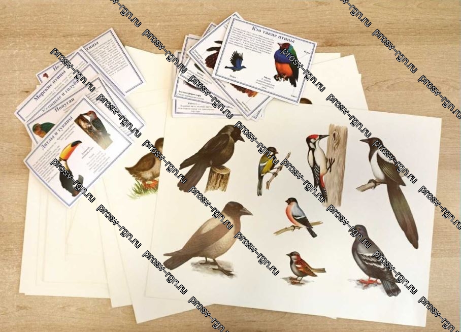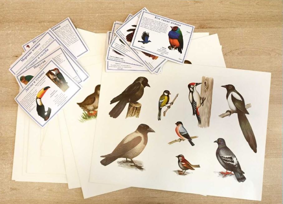 Комплект печатных пособий, включающий в том числе таблицы с изображениями домашних, диких, декоративных птиц, набор раздаточных карточек «Птицы»
