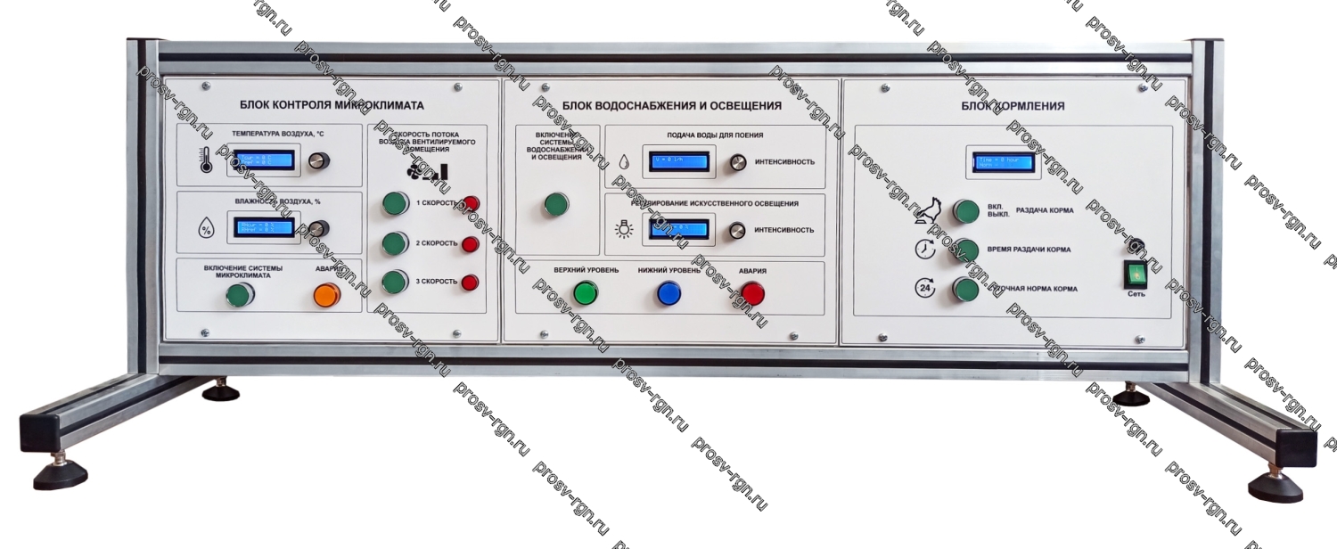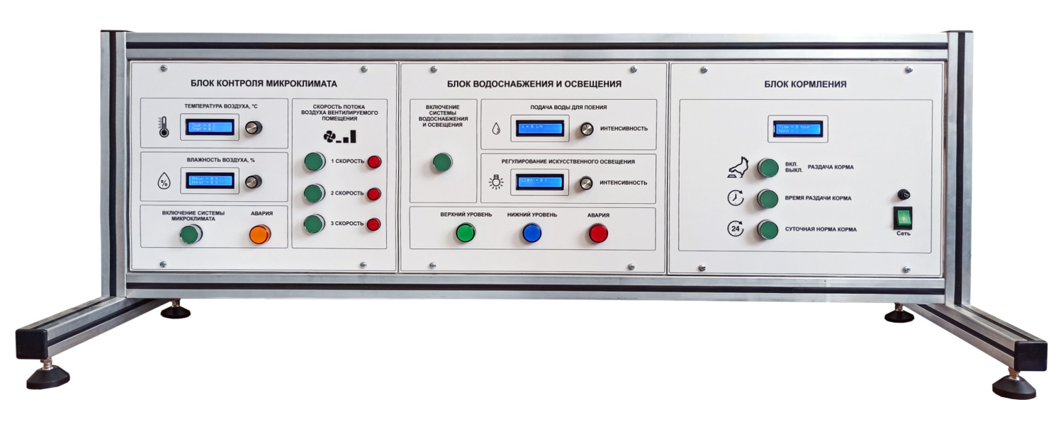 Представляет собой настольную конструкцию с органами управления, сигнальными лампами и дисплеями, отображающими текущие и вводимые значения. Также в комплектацию входит программное обеспечение «Система управления птицефермой», предназначенное для установки на персональный компьютер (ПК не входит в комплект поставки) и позволяющее осуществлять симуляцию контроля и управления работой птицефермы.
