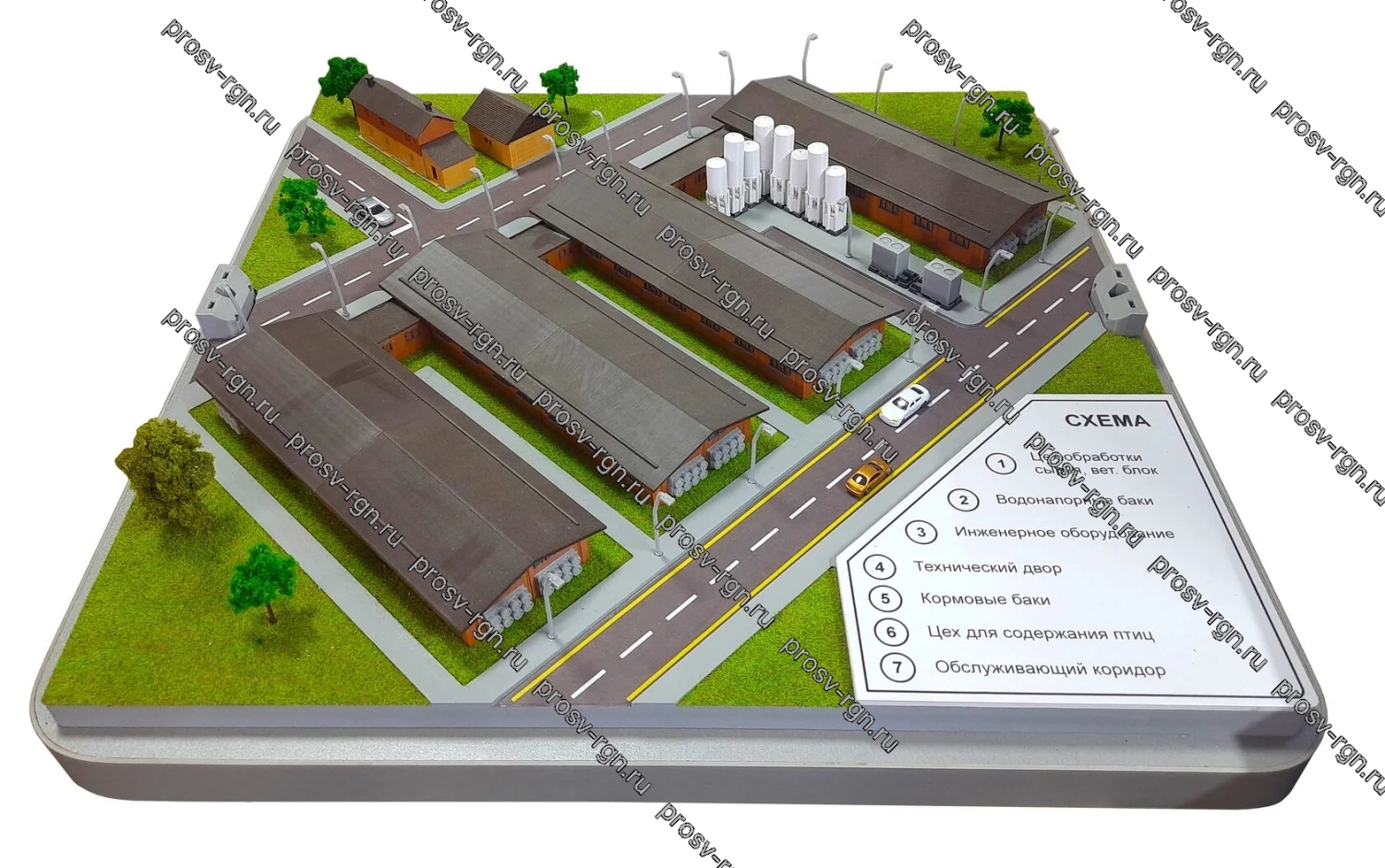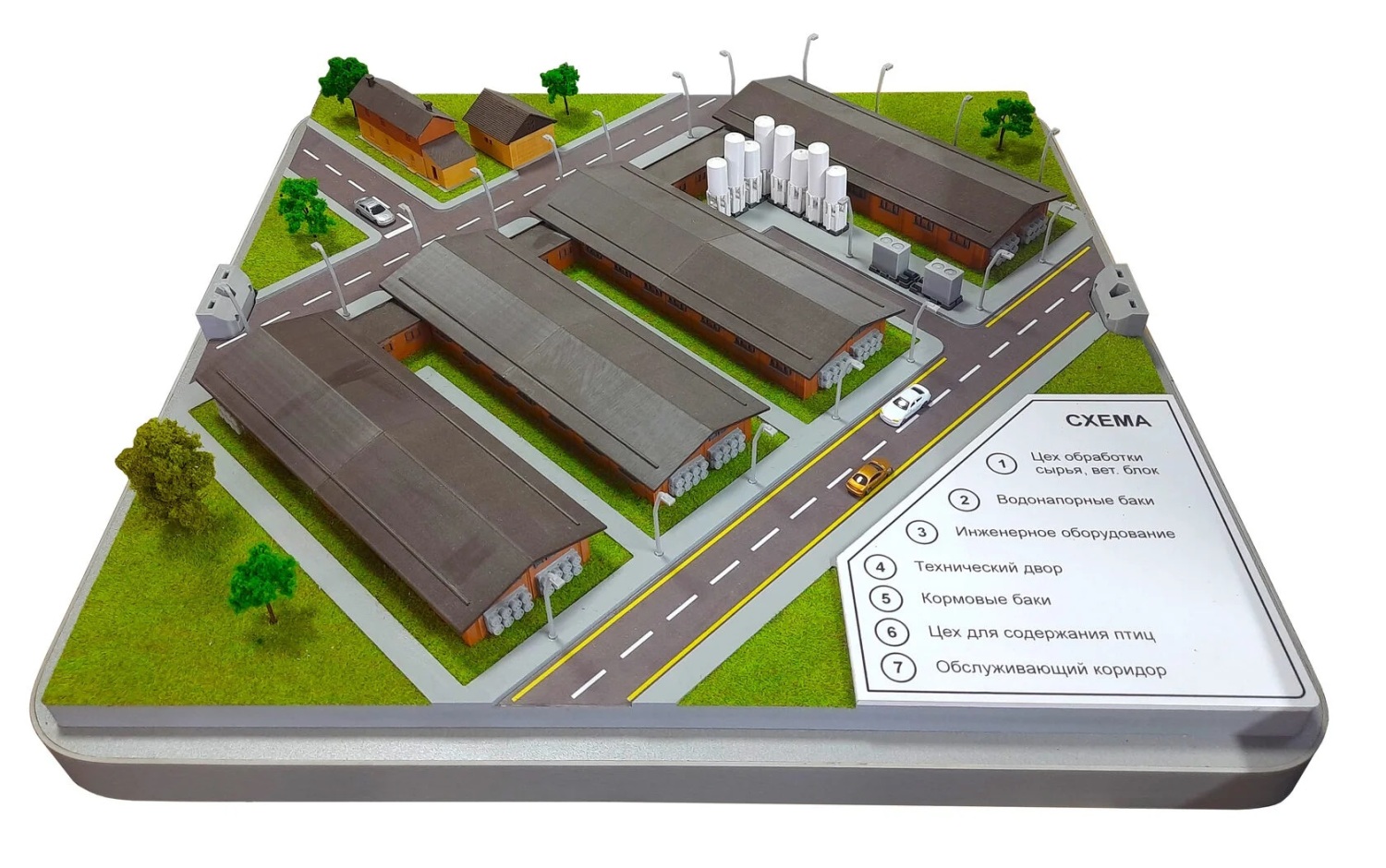Макет предназначен для демонстрации общей структуры и организации пространства птицефабрики (расположение основных объектов).