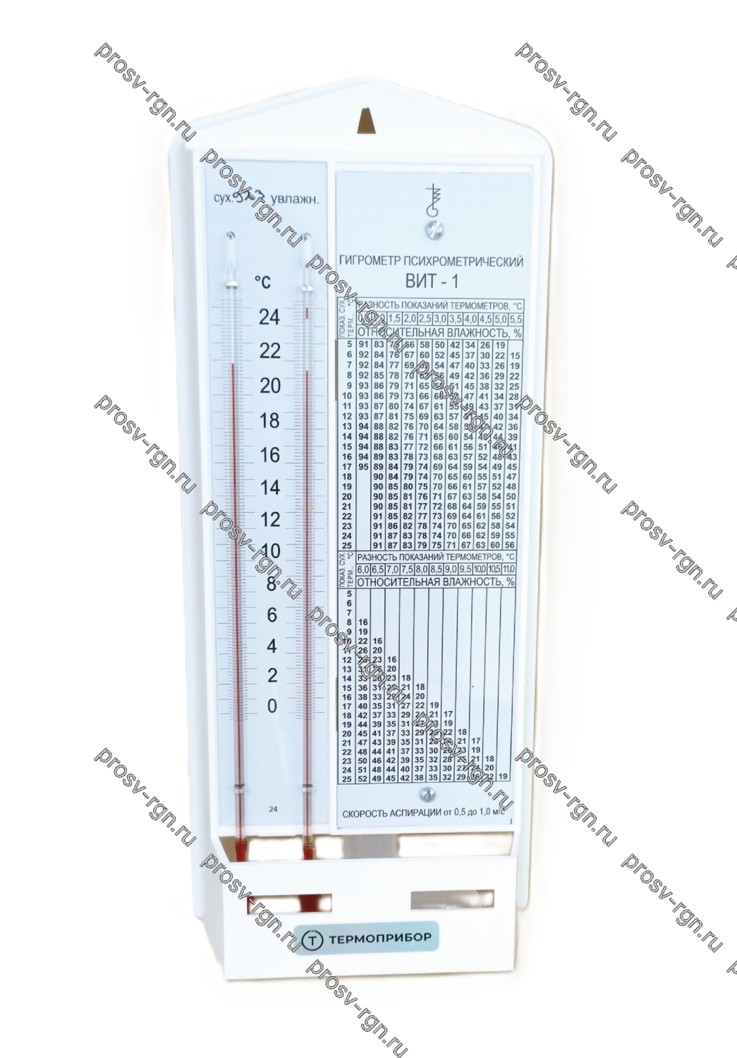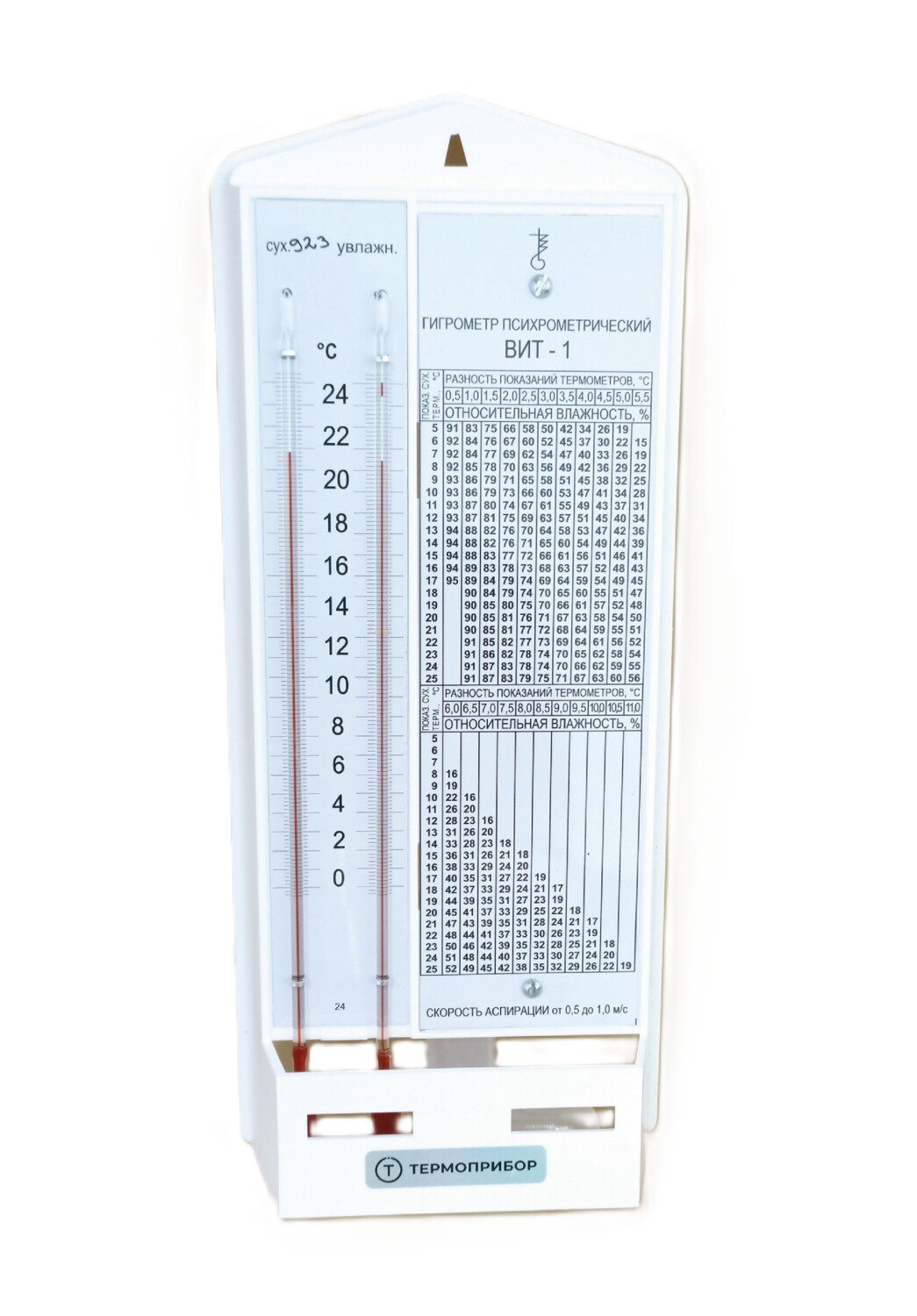 Гигрометр психрометрический предназначен для измерения относительной влажности и температуры воздуха в помещении. Диапазон измерения относительной влажности: от 20% до 90%. Диапазон измерения температуры, °С: от 0 до 25. Цена деления шкал термометра: 0,2 °С. Скорость аспирации: от 0,5 до 1,0 м/сек. Комплектность: гигрометр – 1 шт., питатель – 1 шт., фитиль – 1 шт.