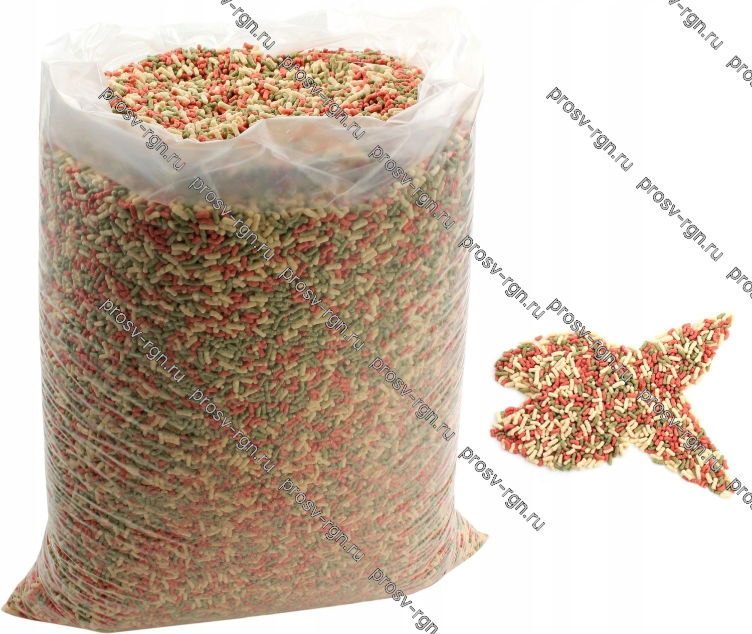 Набор различных комбикормов в рассыпном или гранулированном виде для карпа, радужной форели и других рыб — объектов товарного рыбоводства