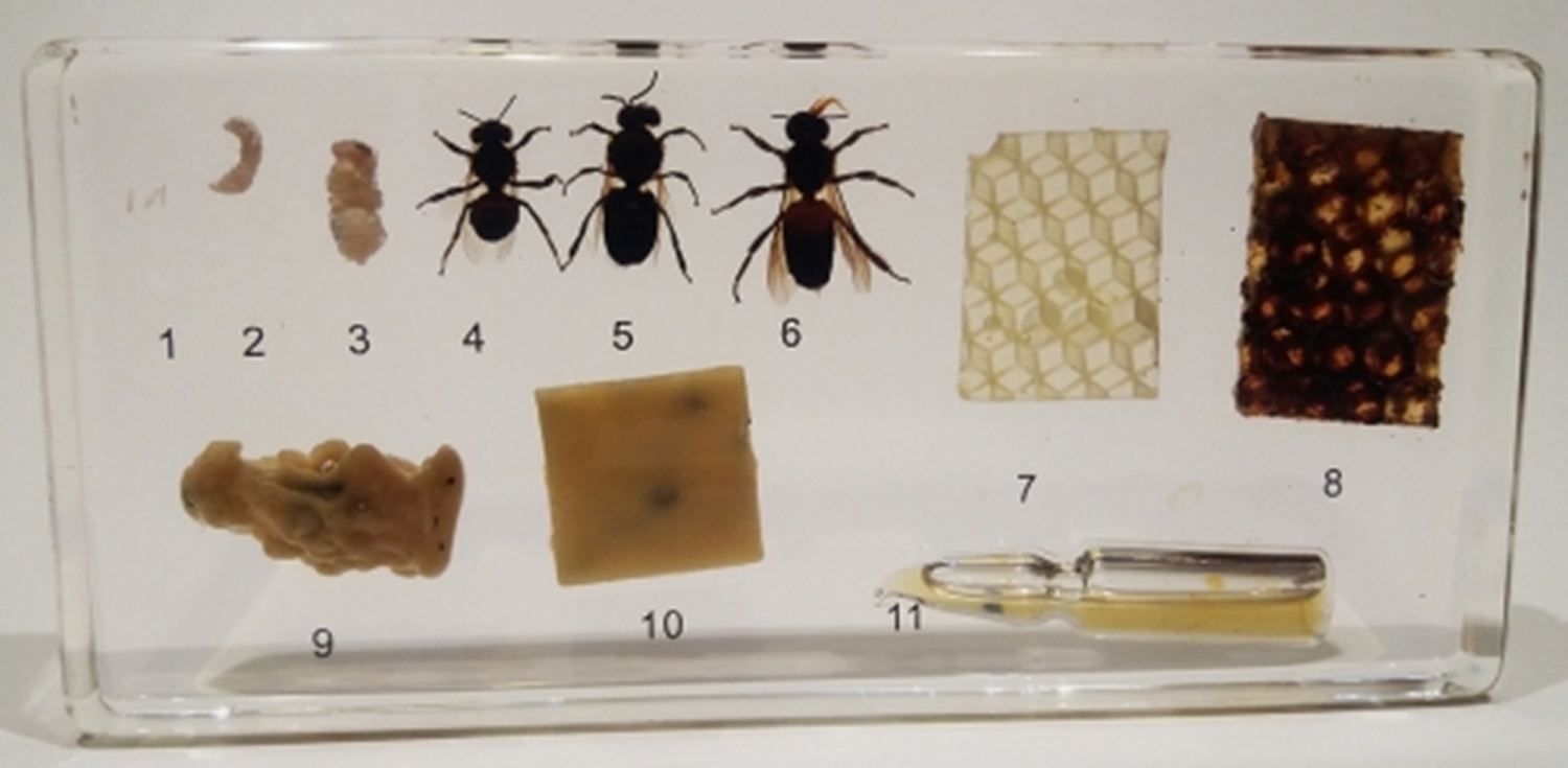 Коллекция представляет собой законсервированный в пластмассовом прозрачном блоке методом холодной полимеризации препарат пчелы - ее различные стадии развития (яйцо, личинка, куколка, рабочая пчела, трутень, матка), а также содержит соты, часть улья, пыльцу, пчелиный воск, мёд.