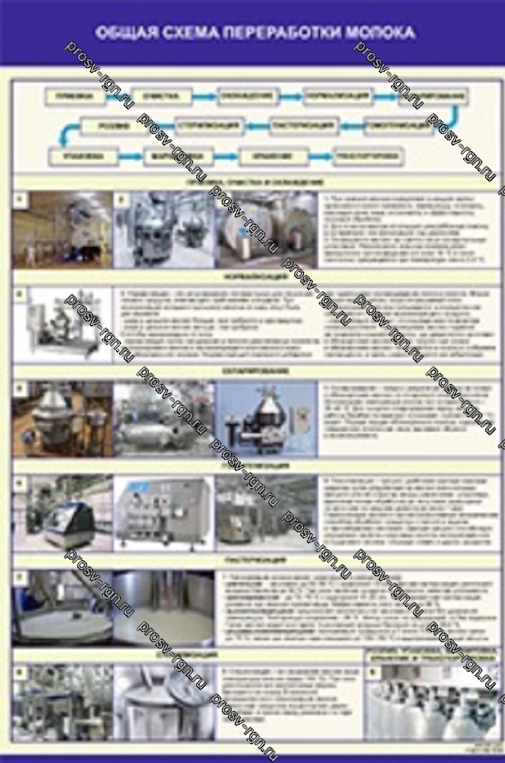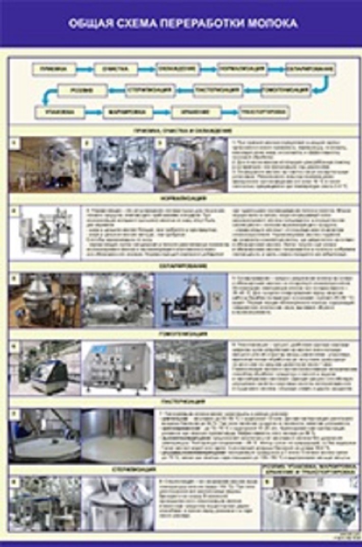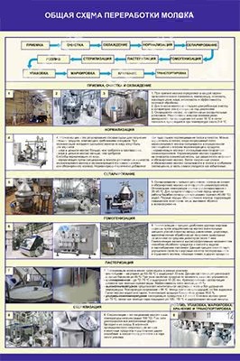Стенд содержит блок-схему с отображением последовательности этапов переработки молока, а также информация по данным этапам в следующем составе: