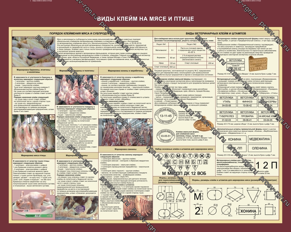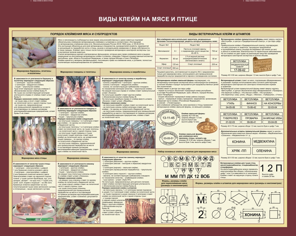 На стенде описан и проиллюстрирован порядок клеймения мяса и субпродуктов.