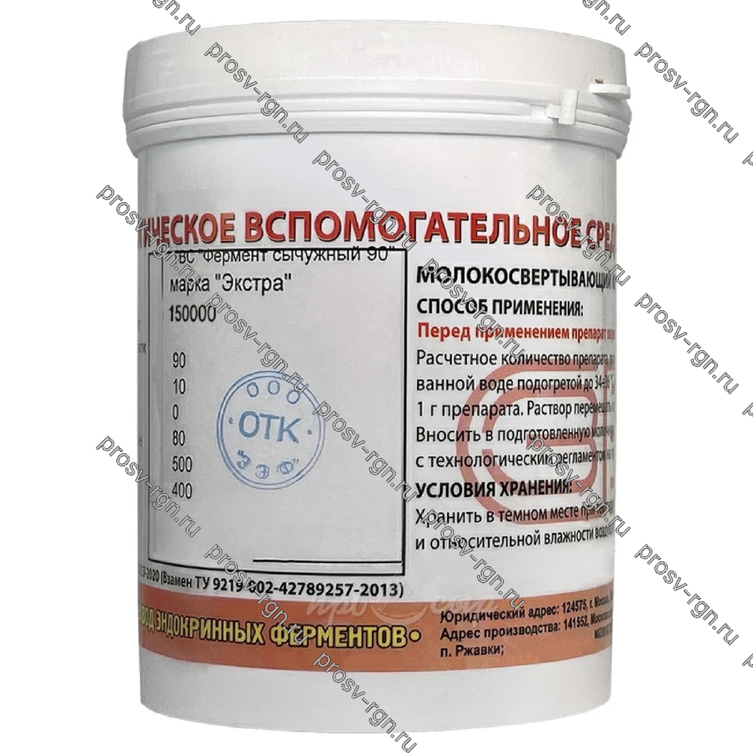 Дозировка: 2,8-3 гр на 100 литров для производства сычужных сыров, 0,1-0,2 гр на 100 л для производства сычужного творога.