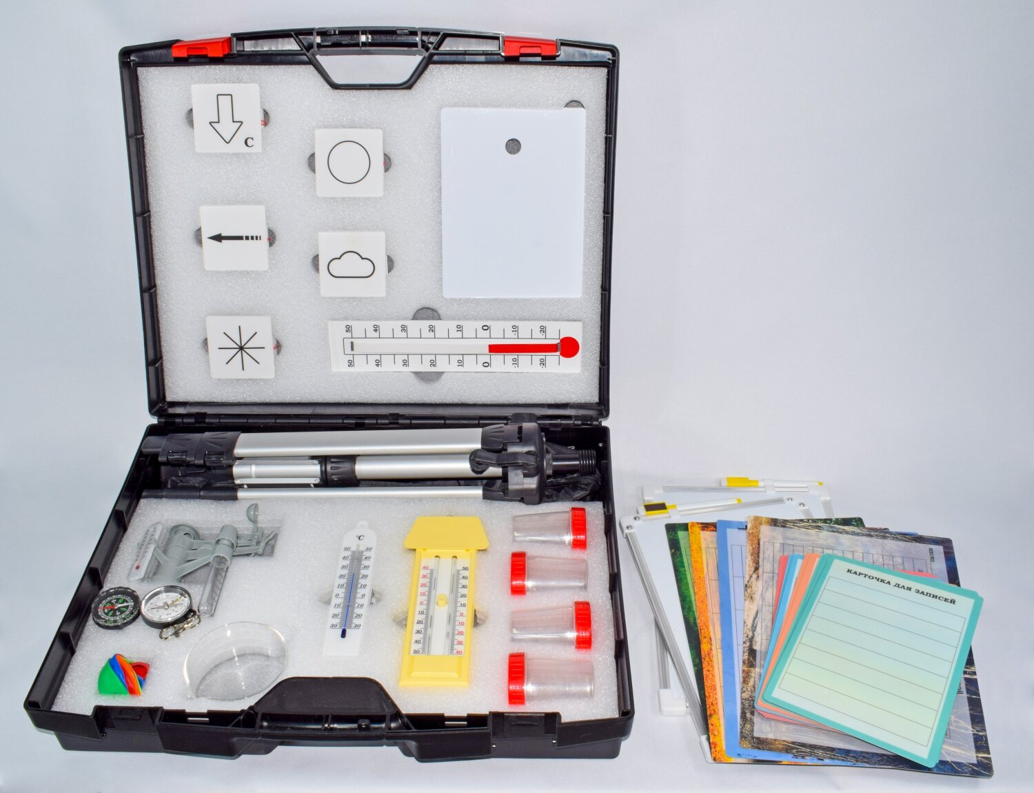 Предназначен для наблюдения за погодными явлениями. С помощью комплекта учащиеся освоят навыки работы с измерительными приборами, а также систематизируют свои знания о понятии «погода» и изучат 4 ее составляющие – температуру, облачность, осадки и силу ветра