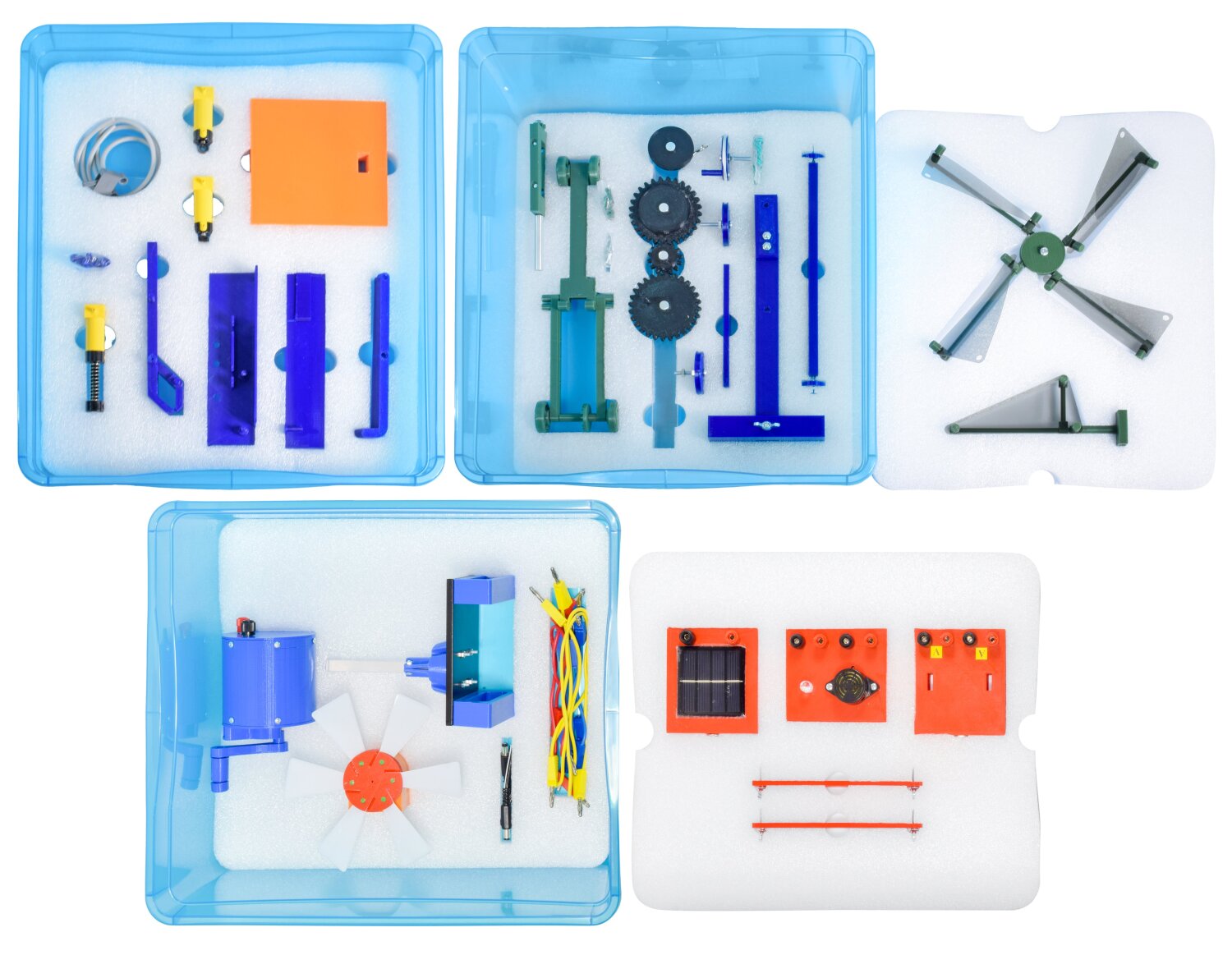 Комплект содержит наборы, предназначенные для изучения понятия инерция, ускорение, сохранение энергии и импульса, пневматика, возобновляемые источники энергии.