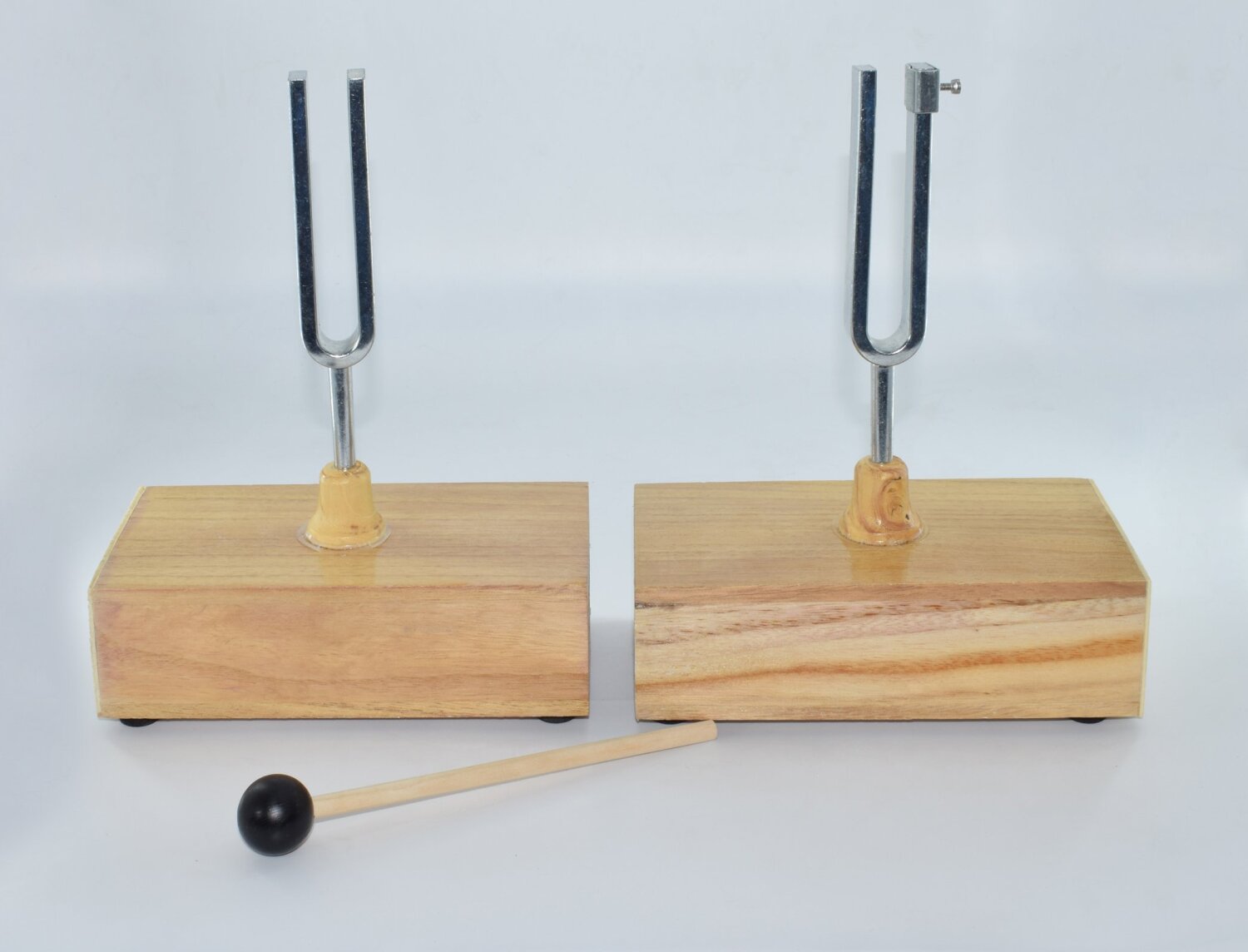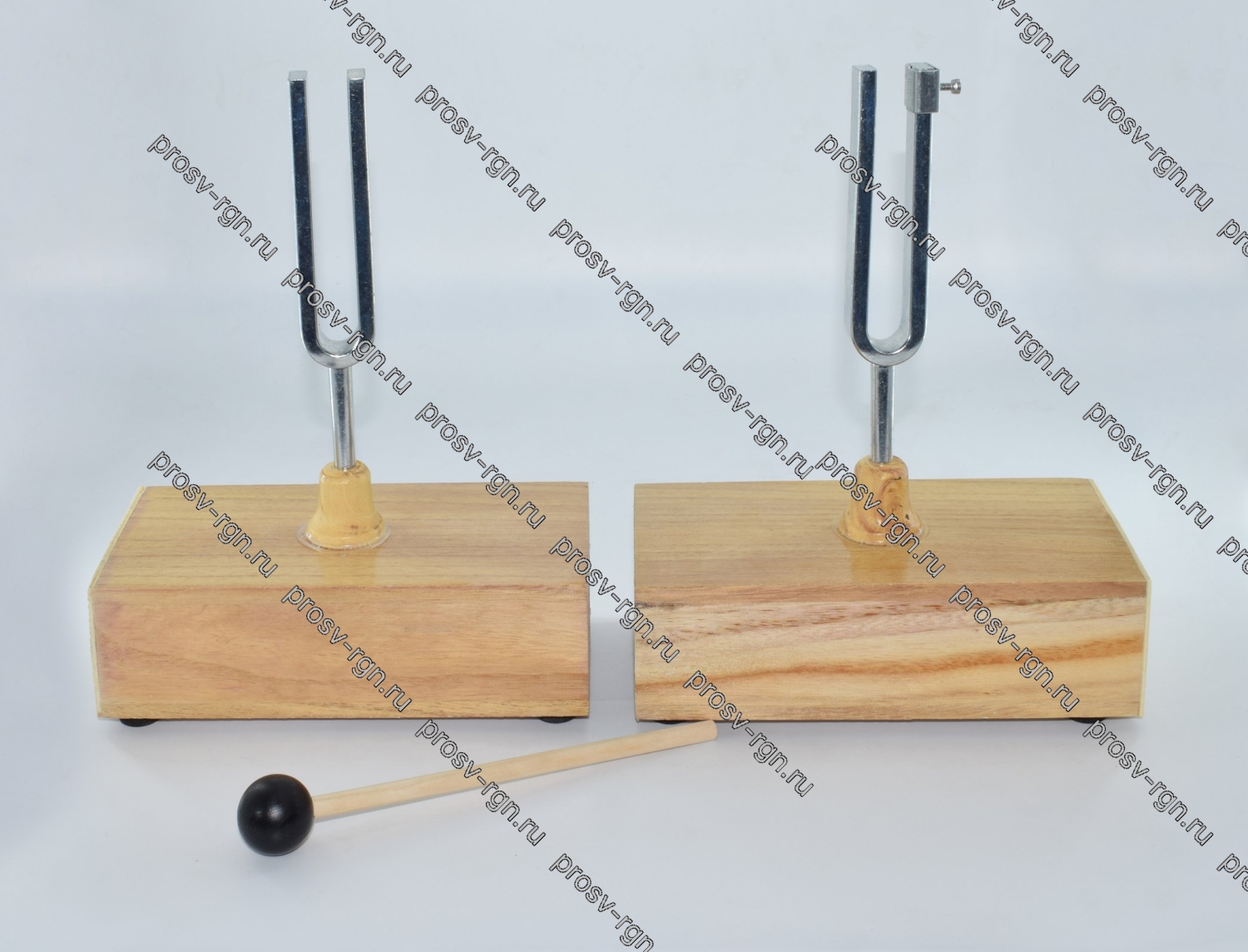 В комплект входят два одинаковых камертона частотой 440 Гц на резонирующих ящиках и резиновый молоточек. Каждый камертон представляет собой массивную стальную вилку на ножке, имеющую строго определенную длину ветвей прямоугольного сечения. Камертоны настроены в унисон - тон «ля» 1-ой октавы.