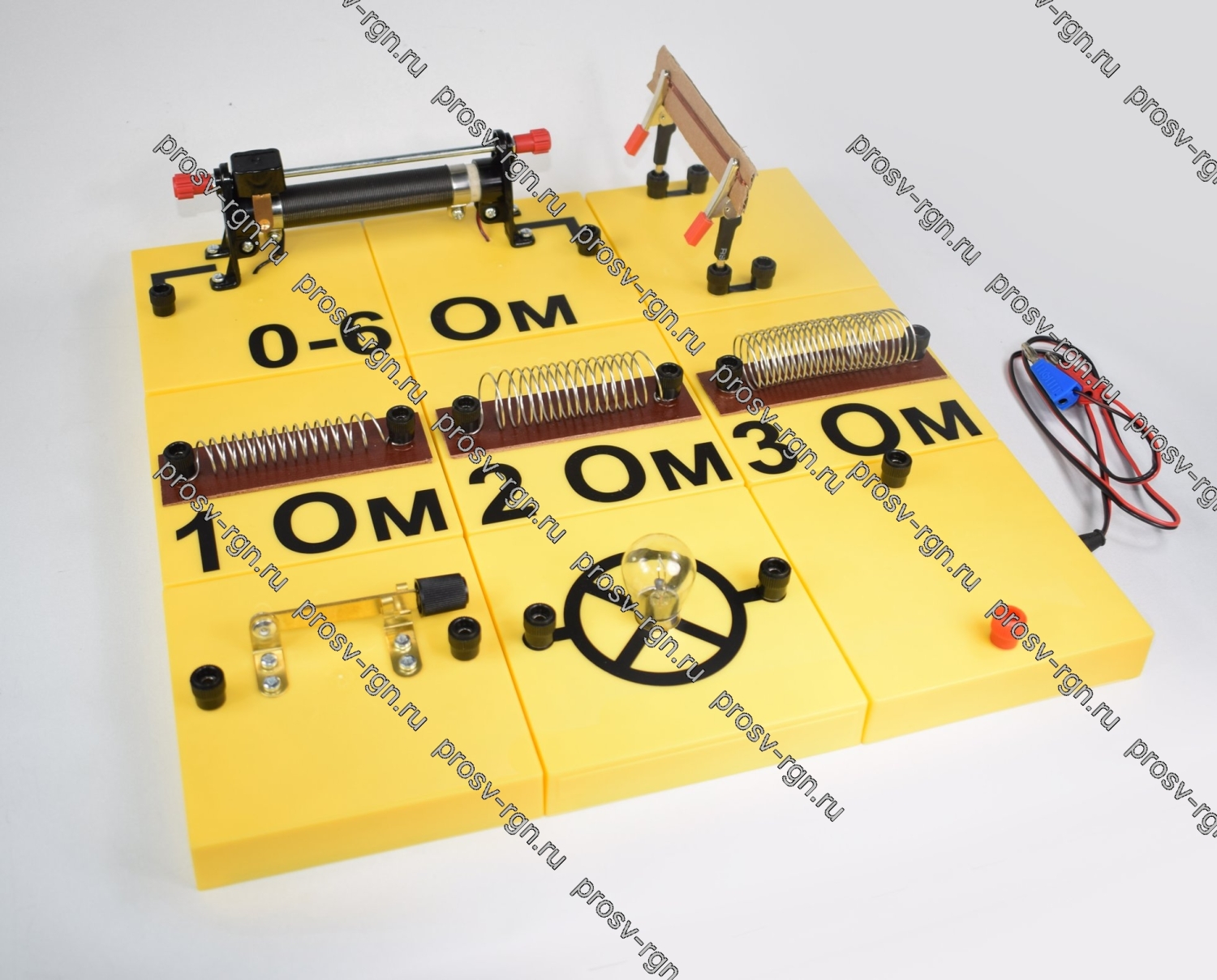 Предназначен для демонстрации основных закономерностей, принципов построения электрических цепей и проведения простейших измерений. Предусмотрена возможность проведения 12 опытов.
