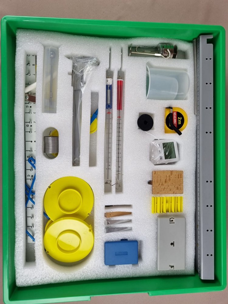 В состав входят: Направляющий монорельс; Тележка легкоподвижная; Электронный секундомер; Рулетка; Деревянный брусок; Стаканы; Груз наборный в комплекте; Держатель пластиковый; Набор гирь; Катушка с нитью; Рычаг-линейка; Штангенциркуль; Держатель блока; Держатель пружины для динамометра (2 шт.); Пластина со шкалой; Набор из трех тел равного объема; Динамометры; Пружина спиральная узкая; Пружина спиральная широкая; Цилиндр мерный; Чаши весов (2 шт.); Подвески чашей (2 шт.); Блоки в оправах; Полиспаст из двух блоков на разных осях в одной оправе; Стрелка-указатель (металлическая); Ось-рычаг (из металла); Лоток для хранения оборудования; Методические рекомендации.