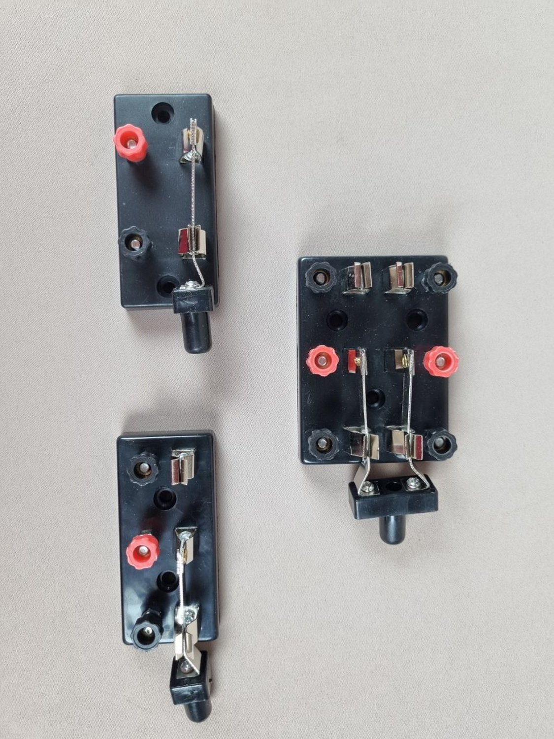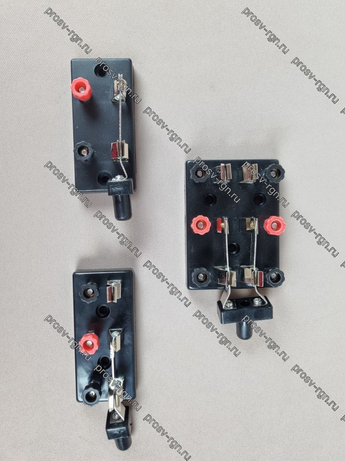 В состав комплекта входят: 1) Выключатель однополюсный - 1 шт. (состоит из пластмассового основания, на котором смонтированы нож переключателя с ручкой, пружинящие губки и универсальные зажимы); 2) Переключатель однополюсный - 1 шт. (состоит из пластмассового основания, на котором смонтированы нож переключателя с ручкой, пружинящие губки и три клеммы. Предназначен для работы при напряжении 12 В и силе тока 2 А. Переключатель имеет три позиции переключения); 3) Переключатель двухполюсный - 1 шт. (представляет собой пластмассовое основание, на котором установлены две пары поворотных ножей с рукояткой, четыре упругих губки и шесть универсальных зажимов. Предназначен для работы при напряжении 24 В и силе тока 2 А. Имеет три позиции переключения).