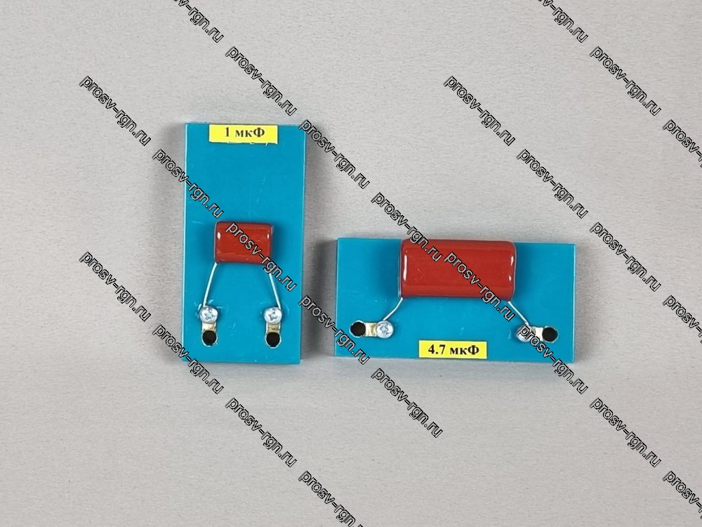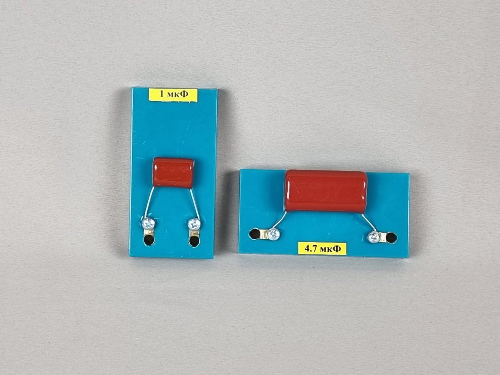 Набор содержит 3 конденсаторов (различных номиналов) на подставках с разъемами для подключения соединительных проводов.