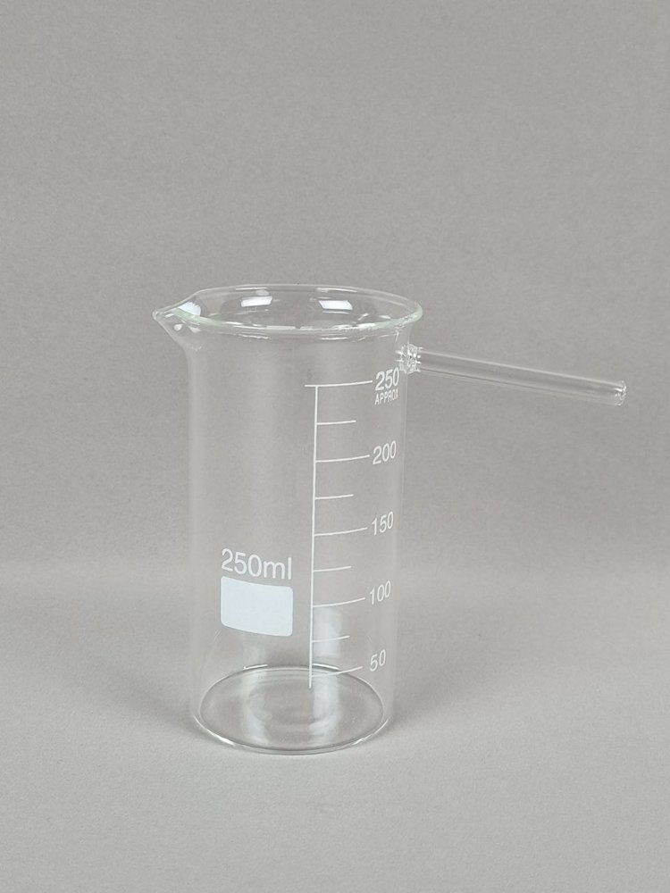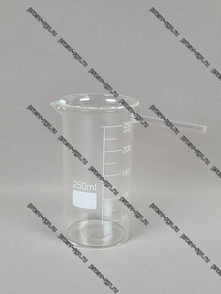 Стакан предназначен для демонстрации способа измерения объема твердых тел любой формы, не входящих в измерительный цилиндр, и использования при исследовании выталкивающей силы. Стакан изготовлен из прозрачного стекла в форме цилиндра, в верхней части которого расположена отливная трубка для слива воды под углом в 70 градусов. Высота стакана 100 мм, наружный диаметр 70 мм. Длина отливной трубки 30 мм.