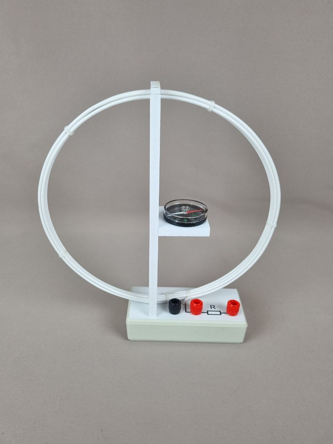 Прибор предназначен для проведения практической работы по определению величины горизонтальной составляющей вектора магнитной индукции Земли. Комплектность: прибор для изучения магнитного поля Земли (в сборе) – 1 шт. Прибор состоит из катушки (6 витков провода диаметром 0,21 м), компаса и резистора. Прибор установлен на подставке.