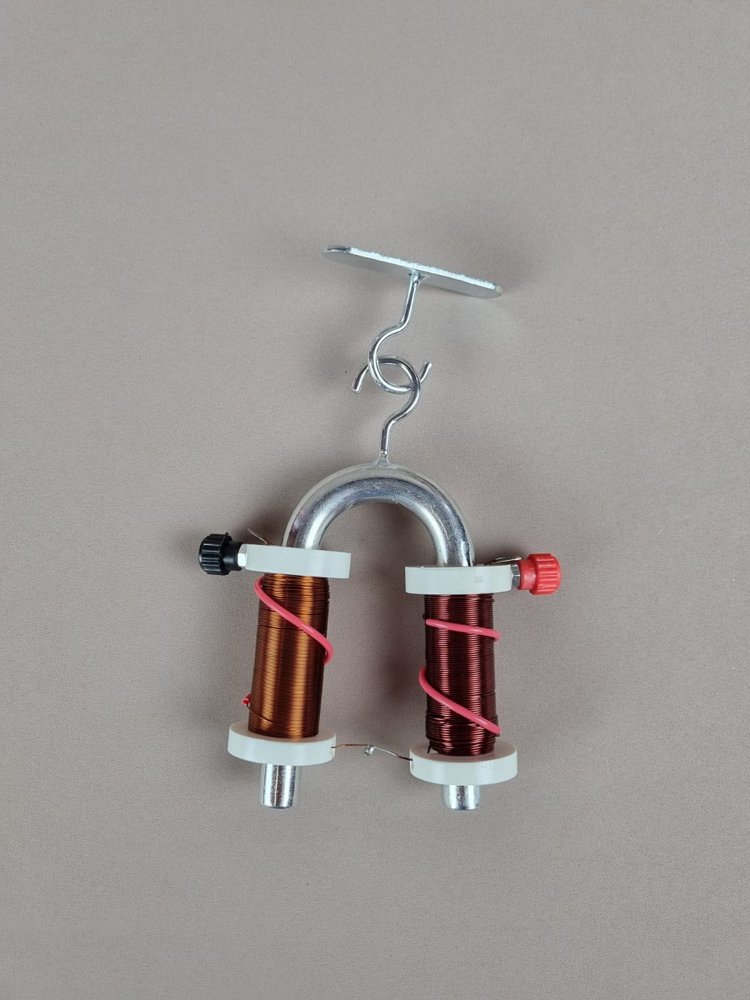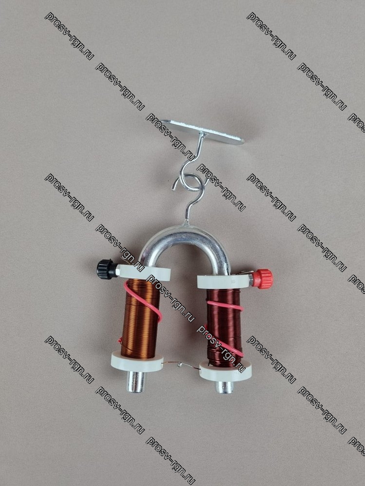 Прибор предназначен для демонстрации подъемной силы электромагнита и его устройства. Электромагнит представляет собой сердечник из мягкой стали подковообразной формы, на концы которого одеты две одинаковые катушки, намотанные на пластмассовые каркасы с зажимами для присоединения источника питания. Катушки соединены последовательно и имеют общее сопротивление 3 Ом. Напряжение питания электромагнита 6 В.