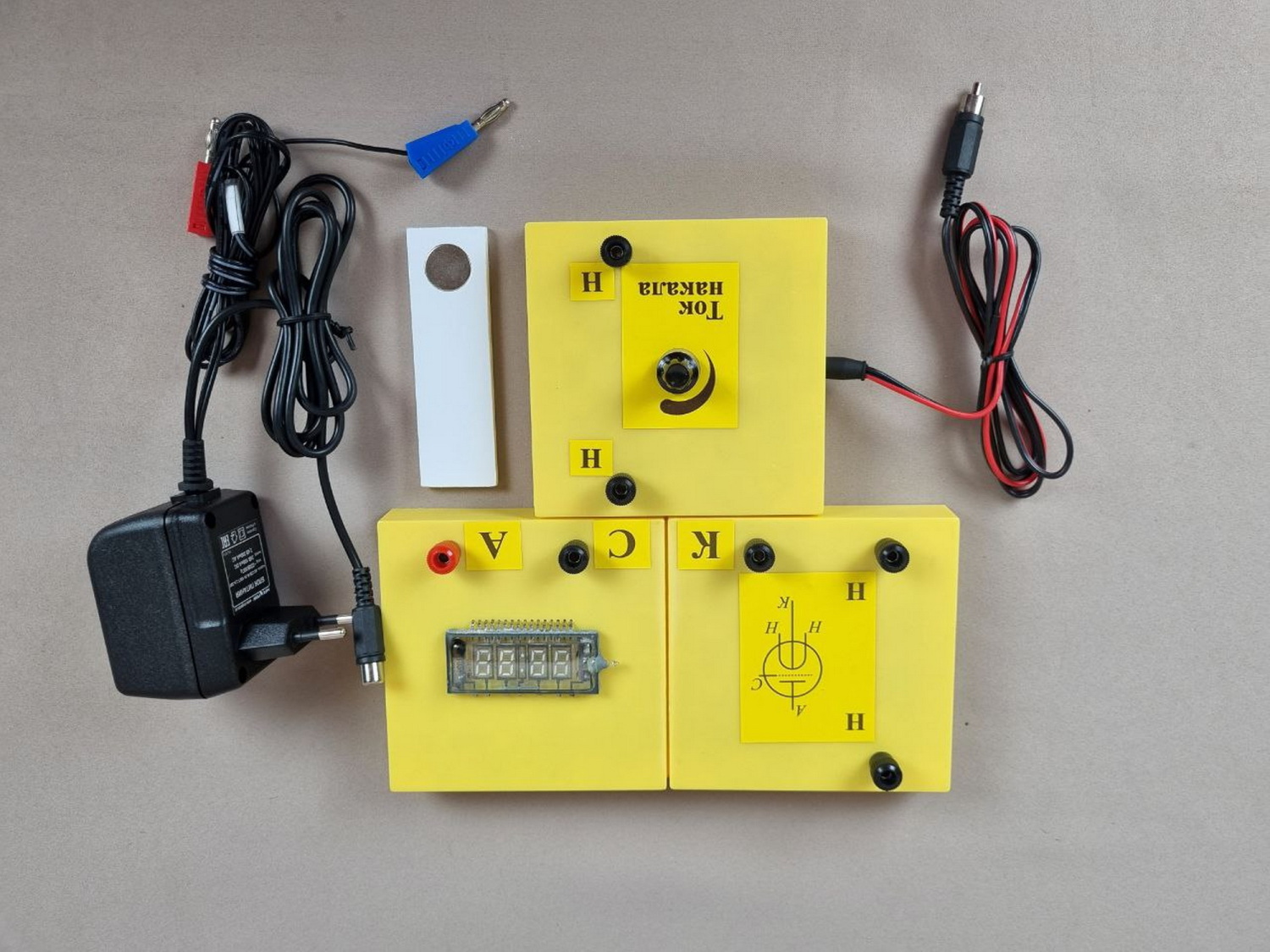 Набор предназначен для демонстрации явлений и закономерностей, изучаемых в теме «Ток в вакууме», экспериментов по изучению зависимости сопротивления металла от температуры и зависимости интенсивности теплового излучения от температуры. Позволяет выполнить демонстрационные эксперименты: Явление термоэлектронной эмиссии в вакууме; Односторонняя проводимость вакуумного диода; Вольтамперная характеристика вакуумного диода; Насыщение вакуумного диода; Движение электронов в магнитном и электрическом поле; Трехэлектродная электронная лампа (триод); Зависимость излучающей способности металла и его электрического сопротивления от температуры. Состав: Электронная лампа; Реостат; Источник питания накала; Источник постоянного тока; Магнит.