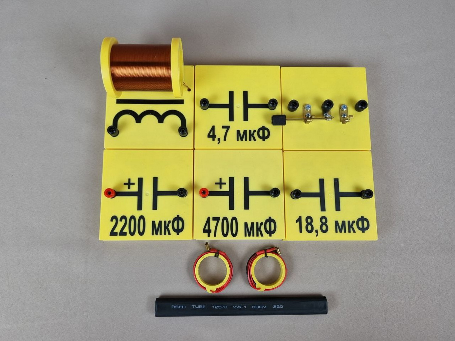 Набор предназначен для выполнения демонстрационных экспериментов с конденсатором и катушкой индуктивности для изучения темы «Переменный электрический ток». Набор обеспечивает выполнение демонстрационных экспериментов по темам: зарядка конденсатора; разрядка конденсатора; энергия заряженного конденсатора; электромагнитная индукция; явление самоиндукции; конденсатор в цепи переменного тока; катушка индуктивности в цепи переменного тока; последовательная цепь переменного тока; резонанс в последовательном колебательном контуре; зависимость резонансной частоты от параметров контура; принцип действия трансформатора. В состав набора входят: конденсаторы, дроссельная катушка с ферритовым сердечником, модуль для подключения катушки индуктивности, катушка-моток.