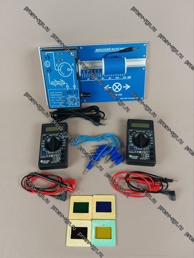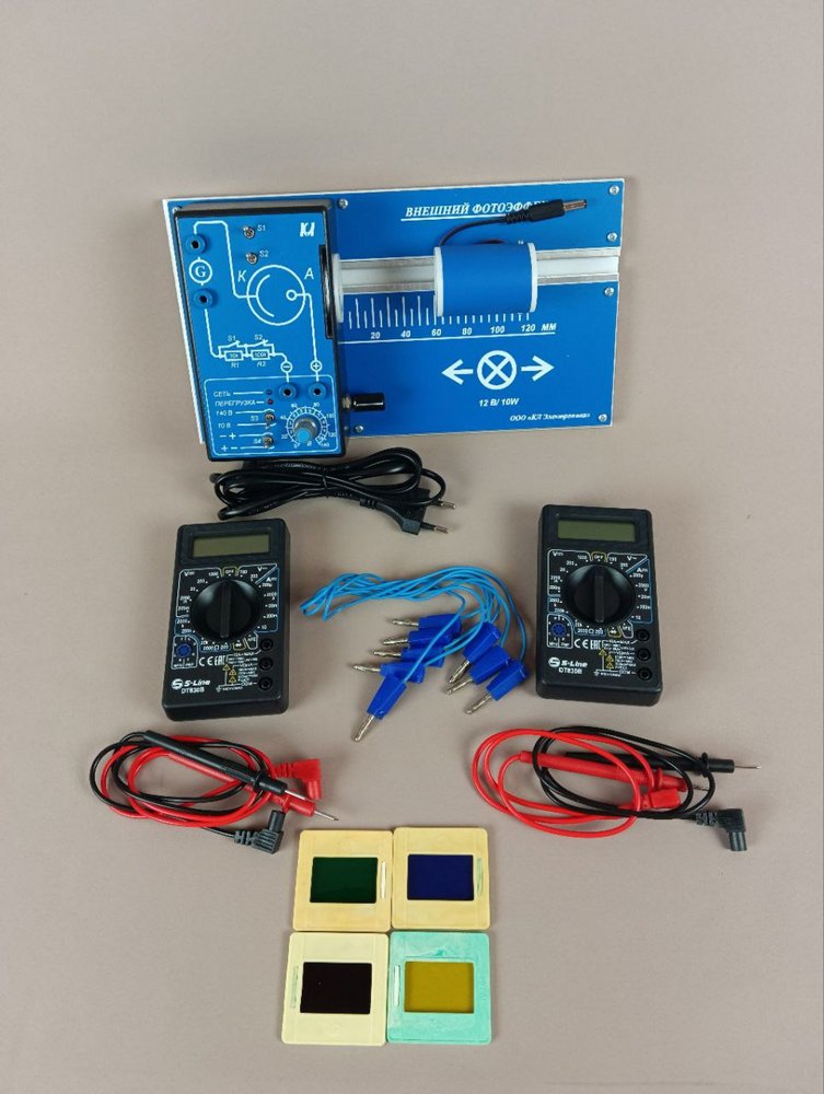 Предназначена для изучения явления внешнего фотоэффекта при проведении демонстраций, лабораторных работ и практикума. Перечень демонстраций включает следующие: Существование внешнего фотоэффекта; Вольтамперная характеристика фотоэлемента; Зависимость тока насыщения от интенсивности света; Нулевой ток фотоэлемента; Обратная вольтамперная характеристика фотоэлемента; Спектры излучения источника света со светофильтрами; Красная граница фотоэффекта; Зависимость кинетической энергии электронов от частоты света; Зависимость кинетической энергии электронов от интенсивности света; Задерживающая разность потенциалов; Определение постоянной Планка. В комплект входят: Магнитный планшет "Внешний фотоэффект" (280х160 мм.) с блоком питания; Источник cвета 12 В; Набор светофильтров (красный, желтый, зеленый, синий); Мультиметр (предел измерения тока 200 мкА) - 2 шт.; Провод - 4 шт.; Методические рекомендации.