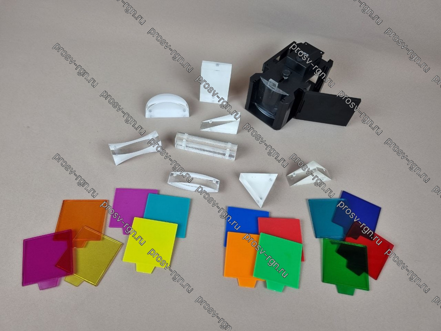 В состав набора входят: Осветитель (напряжение электропитания 12В; мощность лампы 20 Вт); Линза конденсора; Модель сферического зеркала; Диафрагма с тремя и пятью щелями; Диафрагма с одной и двумя щелями; Зеркало плоское; Модель собирающей линзы; Модель рассеивающей линзы; Призма равносторонняя; Призма прямоугольная равнобедренная; Призма остроугольная (Величина внутренних углов 30, 60, 90); Пластинка окрашенная в один из семи основных цветов спектра - 7 шт.; Светофильтр окрашенный в один из семи основных цветов спектра - 7 шт.