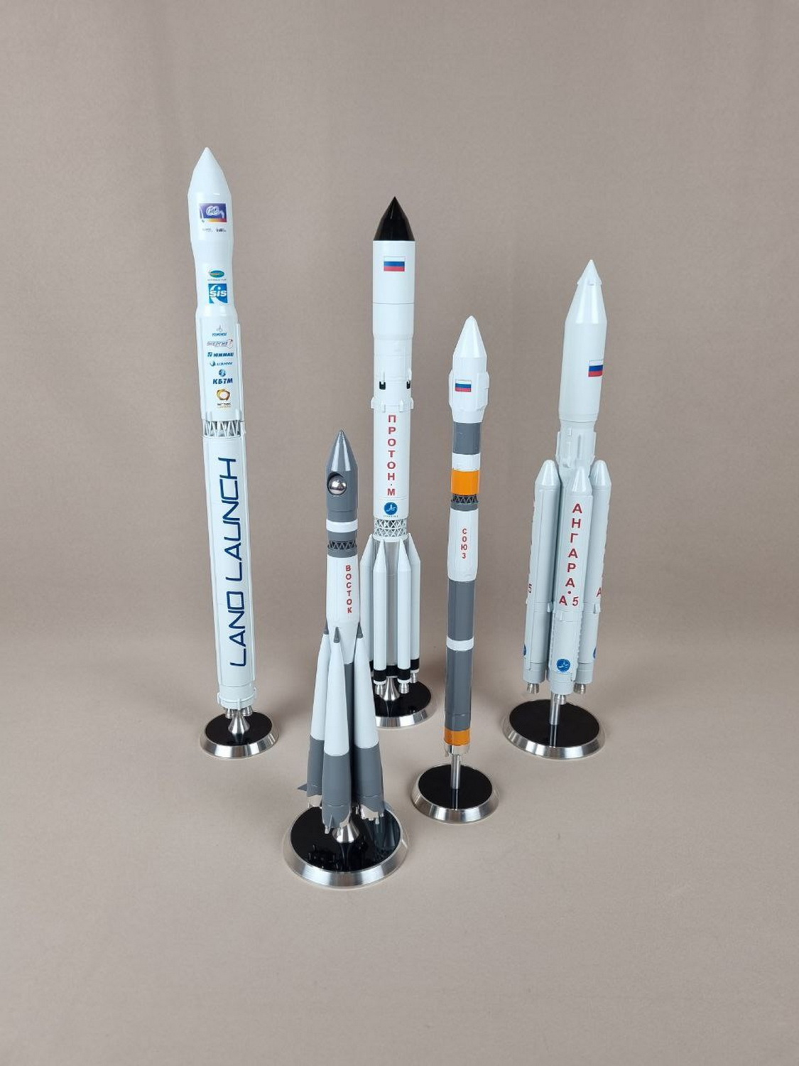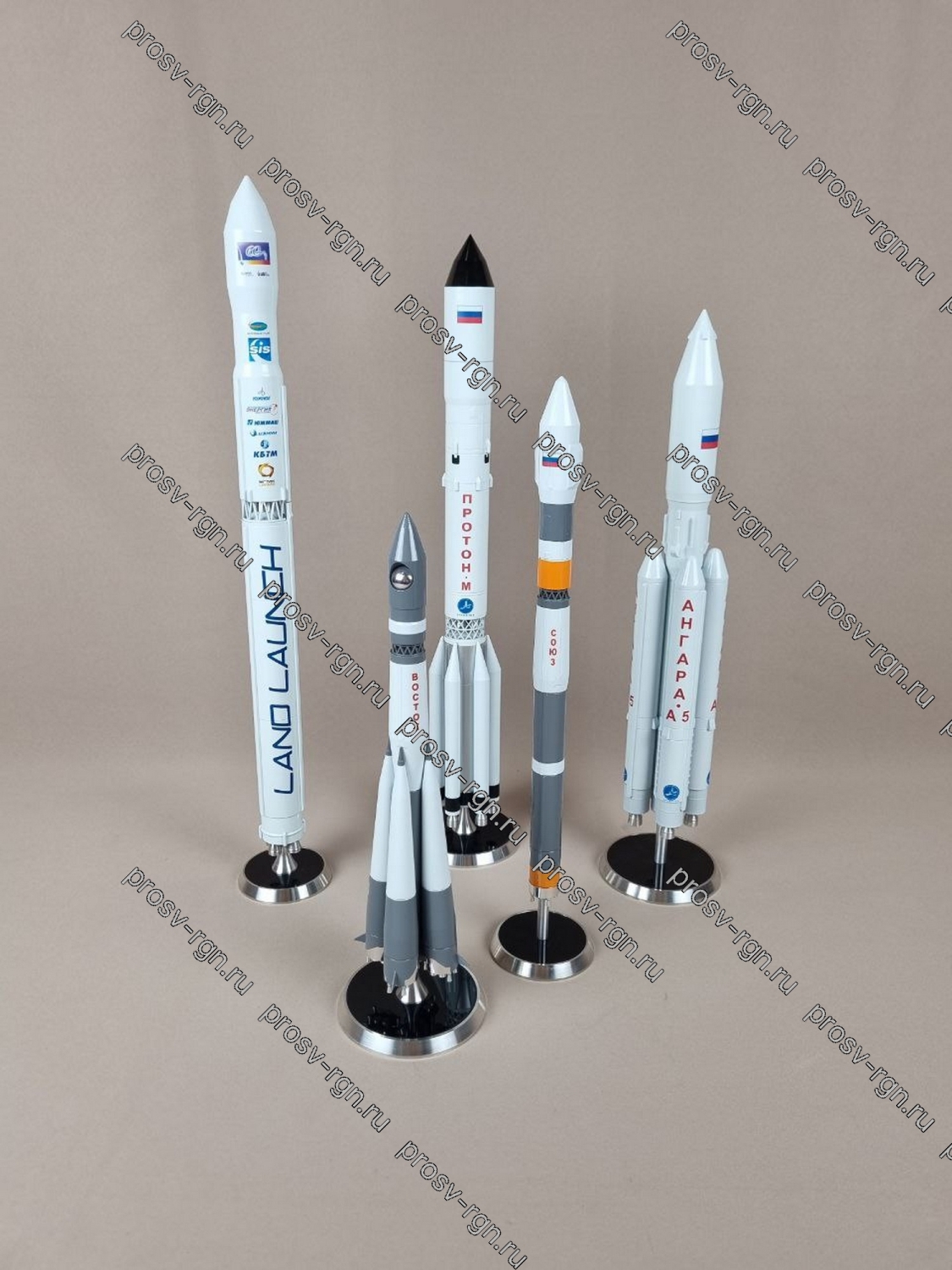В составе набора представлены 5 макетов ракета-носителей: "Ангара-А5" - 1 шт.; "Зенит" - 1 шт.; "Протон-М" - 1 шт.; "Союз 2.1В" - 1 шт.; "Восток" - 1 шт. Масштаб макетов 1:144. Макеты в сборе.