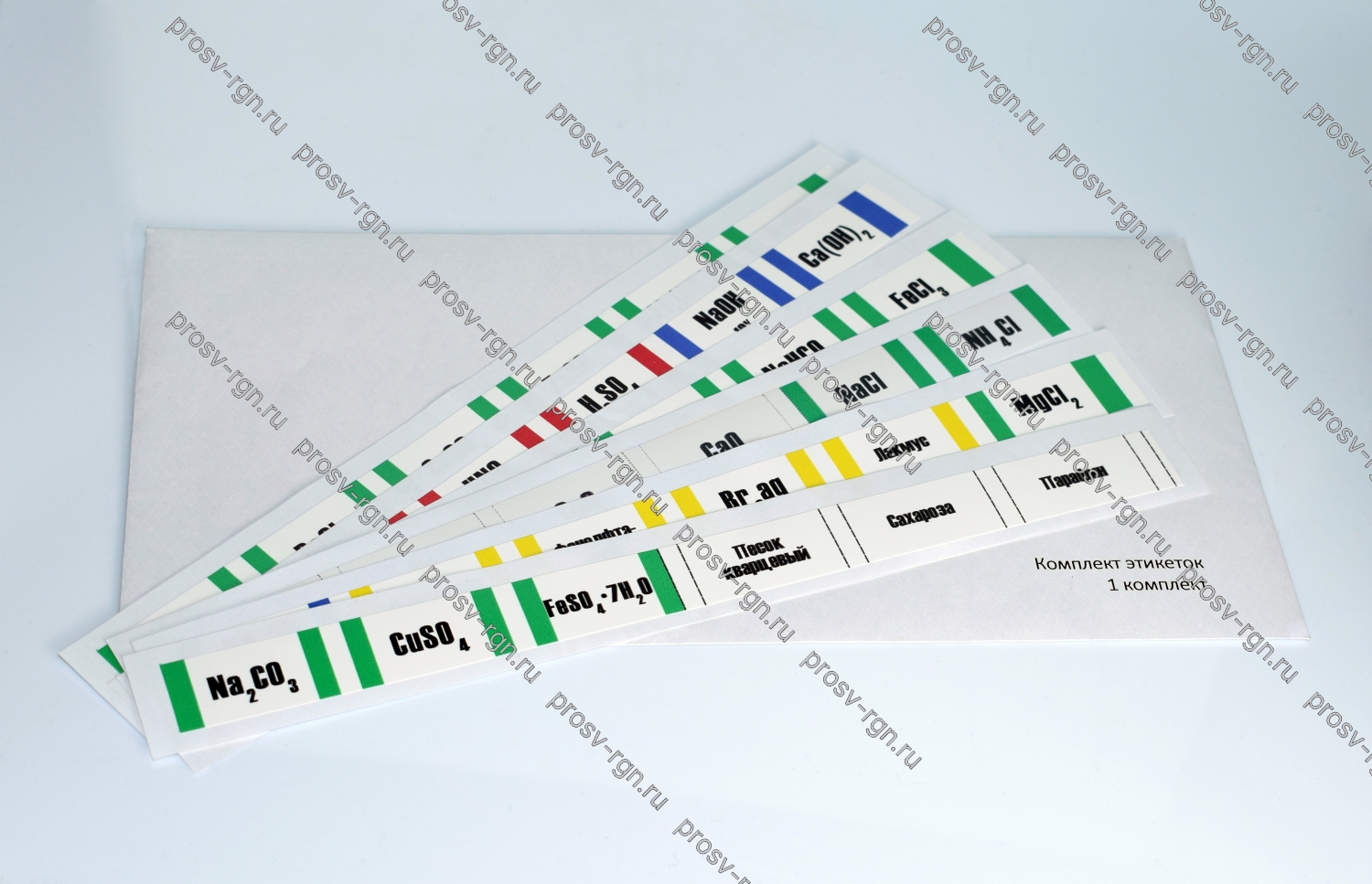 В комплект входят этикетки для основных групп химических реактивов: кислот, оснований, солей, индикаторов, органических веществ (для всех групп применена цветовая индикация).