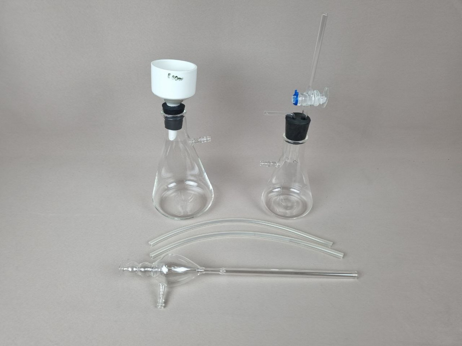 Предназначена для демонстрации процесса фильтрования под вакуумом. Комплектность: колба Бунзена 500 мл - 1 шт., колба Бунзена 250 мл – 1 шт., воронка Бюхнера – 1 шт., насос водоструйный – 1 шт., трубка стеклянная газоотводная – 1 шт., пробка резиновая с отверстием – 1 шт., пробка резиновая с двумя отверстиями – 1 шт., шланги ПВХ – 2 шт., кран соединительный – 1 шт.