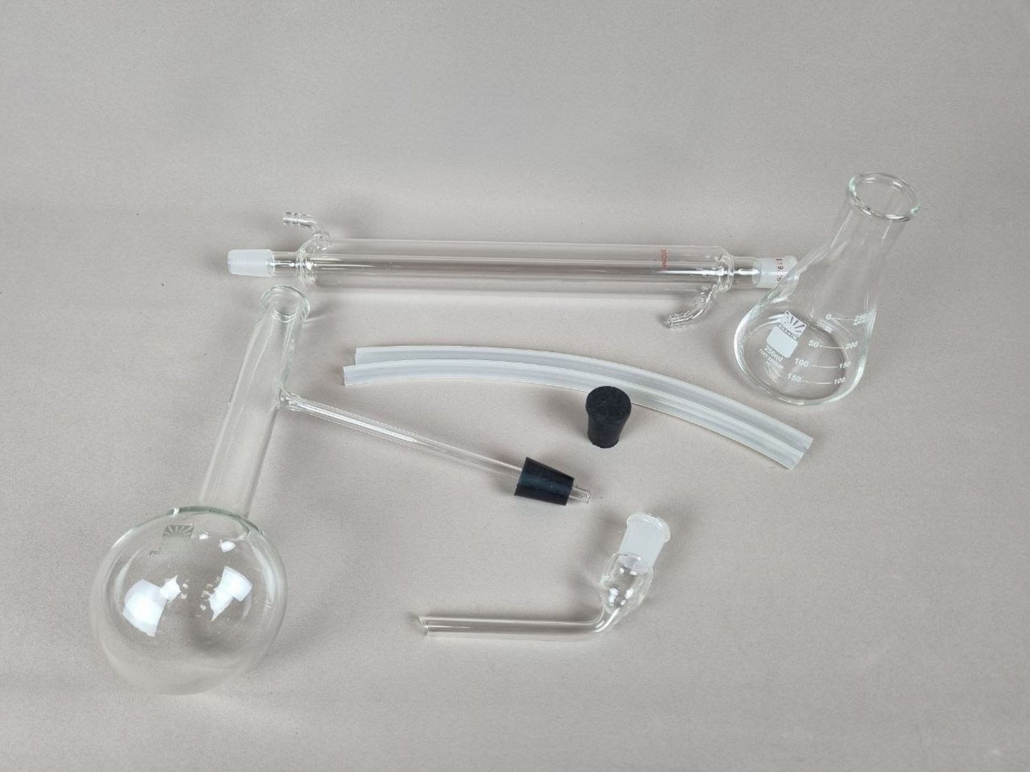 Предназначена для использования в демонстрационных опытах по перегонке веществ. Комплектность: колба Вюрца - 1 шт., холодильник ХПТ-300 - 1 шт., колба коническая 250 мл - 1 шт., пробка резиновая к колбе Вюрца - 1 шт., алонж - 1 шт., пробка соединительная с отверстием - 1 шт., трубка резиновая 30 см - 2 шт.