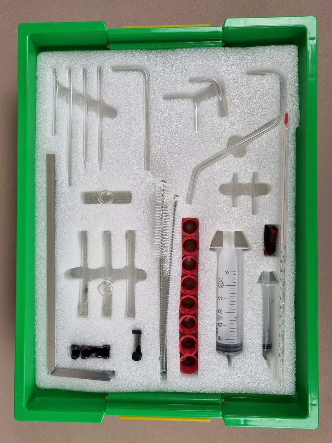 Набор предназначен для проведения лабораторных экспериментов по школьному курсу химии с малыми количествами веществ, что обеспечивает безопасность использования, экономию химических веществ и времени учащихся. Резьбовые соединения позволяют быстро произвести монтаж учебного прибора с надежными креплениями. Использовано толстостенное стекло в деталях, что позволяет обеспечивать повышение уровеня безопасности учащихся. Набор обеспечен методическими рекомендациями по использованию. Состав набора: Сосуд для проведения реакций стеклянный с резьбой длиной 100 мм., диаметром 10 мм. - 1 шт; Сосуд для проведения реакций с резьбой и боковым отводом стеклянный длиной 100 мм., диаметром 10 мм. - 1 шт; Сосуд для проведения реакций с резьбой и боковым отводом с резьбой стеклянный длиной 100 мм., диаметром 10 мм. - 1 шт; Тройник стеклянный диаметром 10 мм. с резьбой - 1 шт; пробка пластмассовая с резьбой - 2 шт; пробка пластмассовая с резьбой и отверстием с диаметром 9 мм. - 6 шт.; прокладка для крышки с отверстием диаметром 8 мм. - 6 шт; трубка газоотводная стеклянная под углом 90 град., диаметром 8 мм. - 1 шт; трубка газотводная стеклянная с наконечником, диаметром 8 мм. - 1 шт; трубка стеклянная под углом 90 град. с оттянутым концом, диаметром 8 мм. - 1 шт; трубка для сбора газов под углом 90 град., кварцевая - 1 шт; пипетка стеклянная, диаметром 8 мм. - 1 шт; трубка стеклянная 100 мм., диаметром 8 мм. - 1 шт; термометр с диапазоном измерения от -10 до +110 ? - 1 шт, профиль алюминиевый Г-образный для монтажа приборов 225х75х10 мм. - 1 шт; зажим для профиля диаметром 16 мм. - 4 шт; зажим для профиля диаметром 35 мм. - 1 шт; шприц на 50 мл. - 1 шт; шприц на 10 мл. - 1 шт; капельница стеклянная 120х8 мм. - 1 шт; ерш для мытья посуды - 1 шт; лоток из ударопрочного пластика с ложементами для всех частей набора - 1 шт.