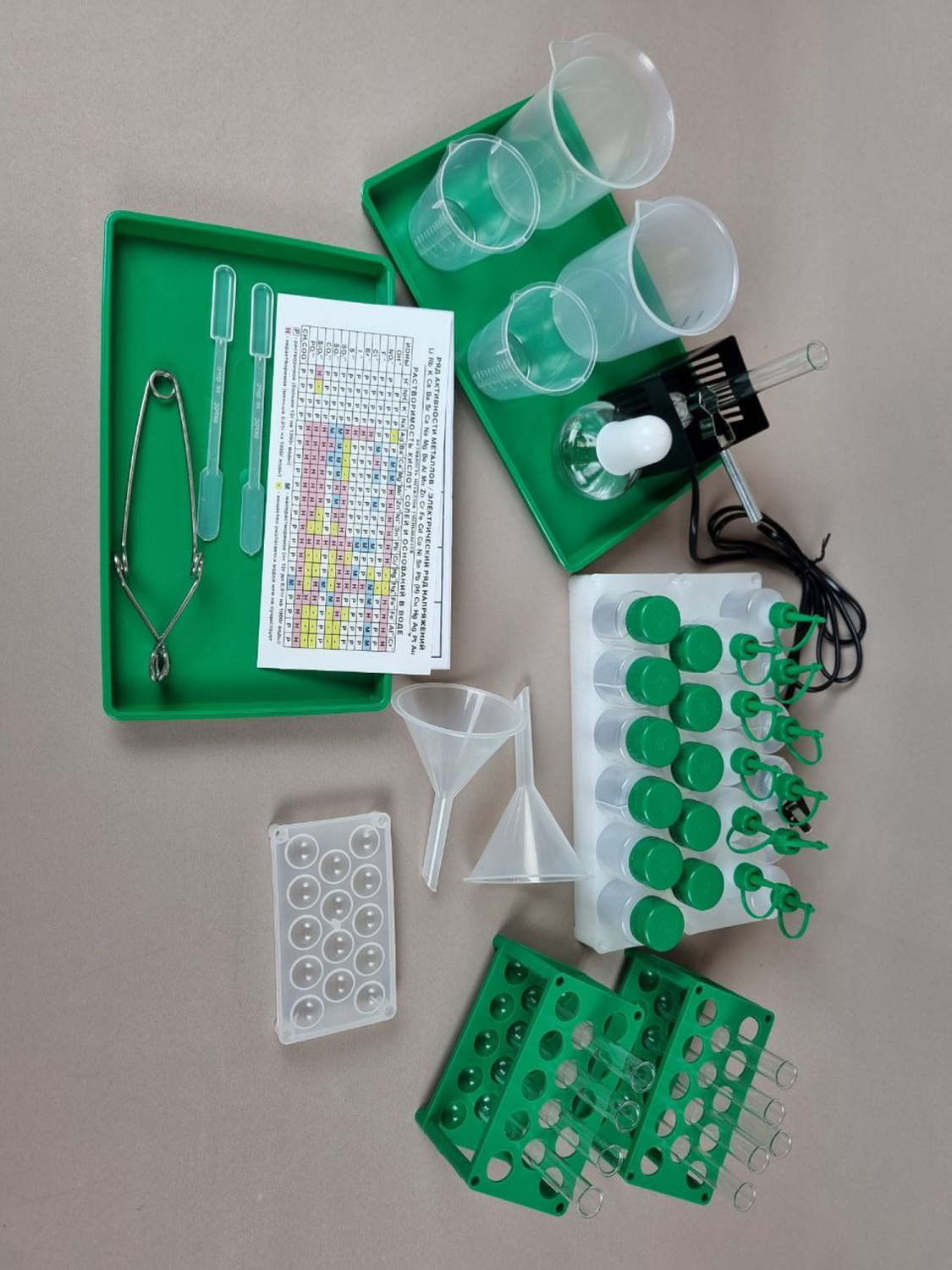 Набор обеспечивает проведение лабораторных опытов, практических работ и решение экспериментальных задач по химии, а также позволяет проводить обучение следующим основным приемам и операциям: перемешивание растворов; работа с лабораторным штативом; нагревание с помощью спиртовки; нагревание с помощью электронагревателя пробирок; монтаж простейших приборов; фильтрование; выпаривание раствора; осуществление капельных реакций. Набор содержит: комплект флаконов с крышками, объемом 30 мл для хранения химических веществ в виде растворов, порошков и гранул - 11 шт.; электронагреватель пробирок мощностью 20 Вт, напряжением питания 42 В - 1 шт.; спиртовку лабораторную вместимостью 25 мл. - 1 шт.; комплект термостойких пробирок - 10 шт.; микродозаторы со съемными крышками-капельницами - 11 шт.; планшетку для проведения капельных реакций - 1 шт.; подставку для флаконов и микродозаторов - 2 шт.; подставку для пробирок на 14 гнезд - 2 шт.; стакан полипропиленовый тип 1, объемом 250 мл. - 2 шт.; стакан полипропиленовый тип 2, объемом 100 мл. - 2 шт.; воронка полипропиленовая на 100 мл. - 1 шт.; этикетки самоклеящиеся с названиями химических веществ - 1 шт; зажим пробирочный металлический - 1 шт.; ложечка-шпатель - 2 шт.; лоток для проведения экспериментов - 2 шт.; таблица химических элементов Д.И.Менделеева и таблица растворимости - 1 шт.; Методические рекомендации - 1 шт. Набор упакован в пластиковую коробку с крышкой.