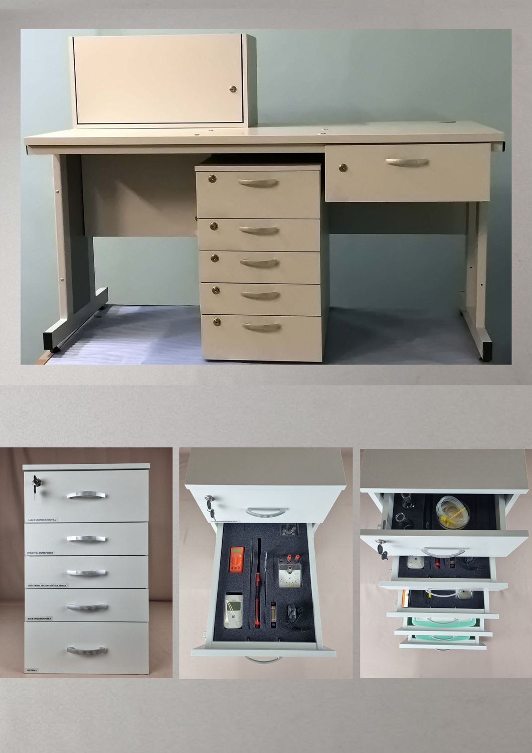 Комплекс включает лабораторный стол с тумбой, которая наполнена лабораторным оборудованием, приборами, узлами и деталями, лабораторной посудой, инструментами, приспособлениями, измерительными приборами, включая цифровую лабораторию. Комплекс обеспечивает возможность проведения 220 лабораторных и демонстрационных работ по химии.