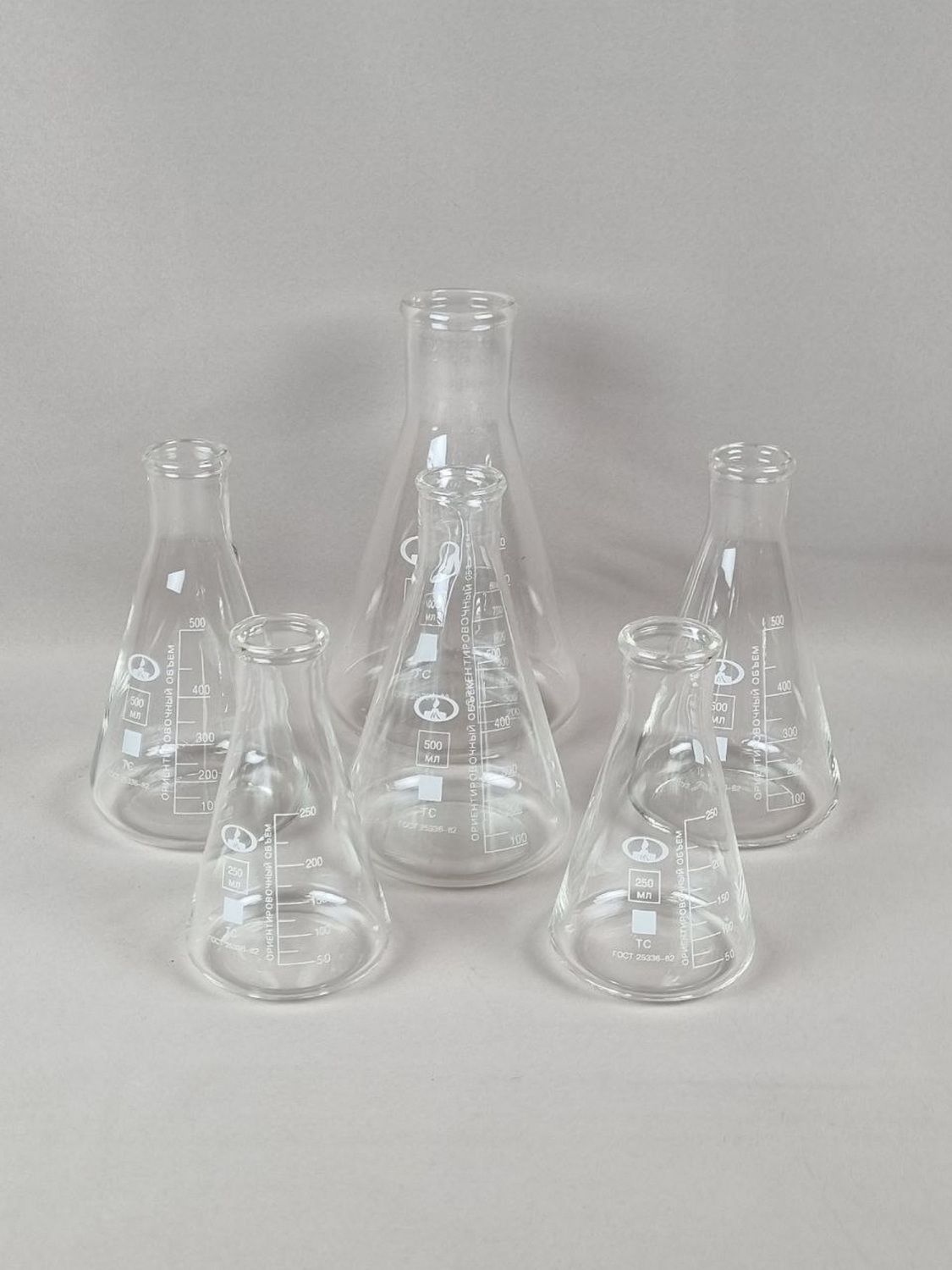 В комплект входят: Колба коническая объемом 250 мл – 2 шт.; Колба коническая 500 мл – 3 шт.; Колба коническая 1000 мл – 1 шт.