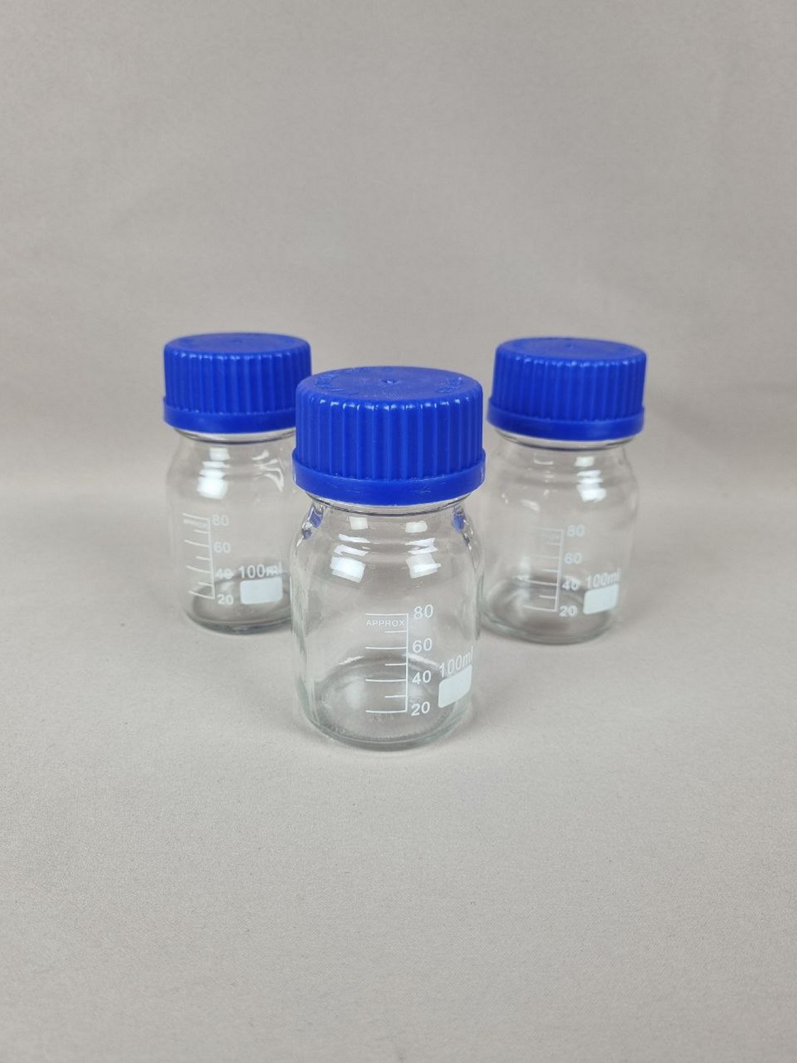 Содержит 3 склянки для реактивов с закручивающимися крышками. Объем склянки 100 мл.