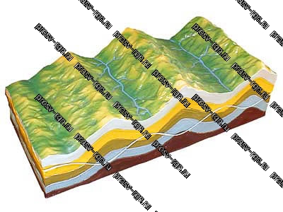 Модель изготовлена из пластмассы. Изображает строение земных складок и эволюций рельефа. На модели показаны: горные хребты, вершины, глубокие межгорные долины, горные реки и разрез складчатого строения.