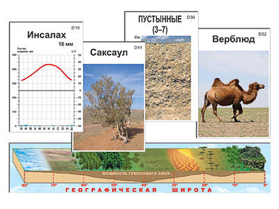 Пособие состоит из шкалы природных зон (Северное полушарие) 105*20 см и 55 карточек 10*15 см. Карточки ламинированы матовой (антибликовой) пленкой, снабжены подписями и магнитами, что позволяет легко крепить их на магнитной доске или экране для динамических пособий. Дополнительно прилагаются 20 магнитов с клеевым слоем для карточек с изображениями представителей флоры и фауны различных природных зон, которые может подобрать учитель.
