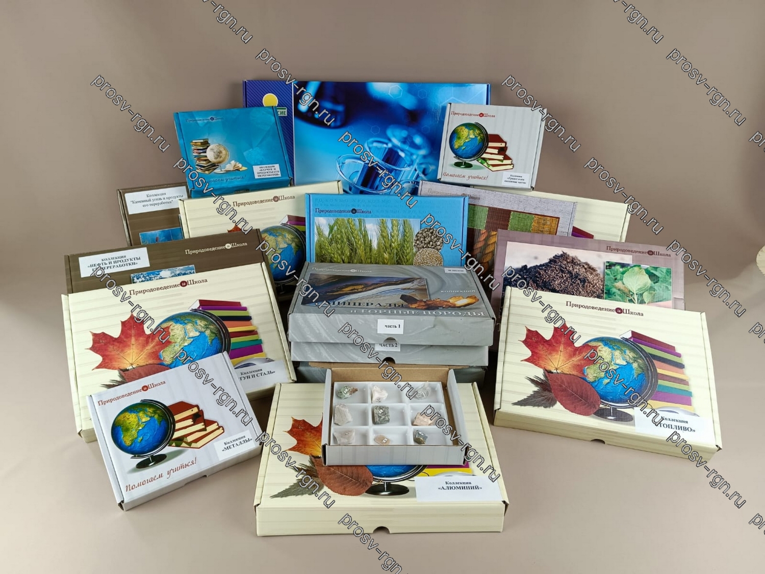 5) Коллекция "Минералы и горные породы" состоит из 3 частей. В состав входят образцы минералов и горных пород: Сера; Графит; Пирит; Халькопирит; Галенит со сфалеритом; Флюорит; Боксит; Кварц молочный; Кварц прозрачный; Яшма цветная; Яшма техническая; Гематит; Магнетит; Марганцевая руда; Кальцит; Магнезит; Доломит; Хризотил-Асбест; Апатит; Фосфорит; Гипс пластинчатый; Гипс алебастр; Барит; Алунит; Мусковит; Кремень; Биотит; Полевой шпат (микроклин); Полевой шпат (лабрадор); Нефелин; Мрамор белый; Мрамор серый полосчатый; Гнейс; Габбро; Диорит; Гранит красный; Базальт; Туф вулканический; Песчаник; Известняк плотный; Мергель; Известняк раковистый; Сланец глинистый; Кварцит; Глина; Тальковый сланец; Каменный уголь (антрацит); Серпентин. Образцы занумерованы согласно номерам в списках и размещены в ложементах.
