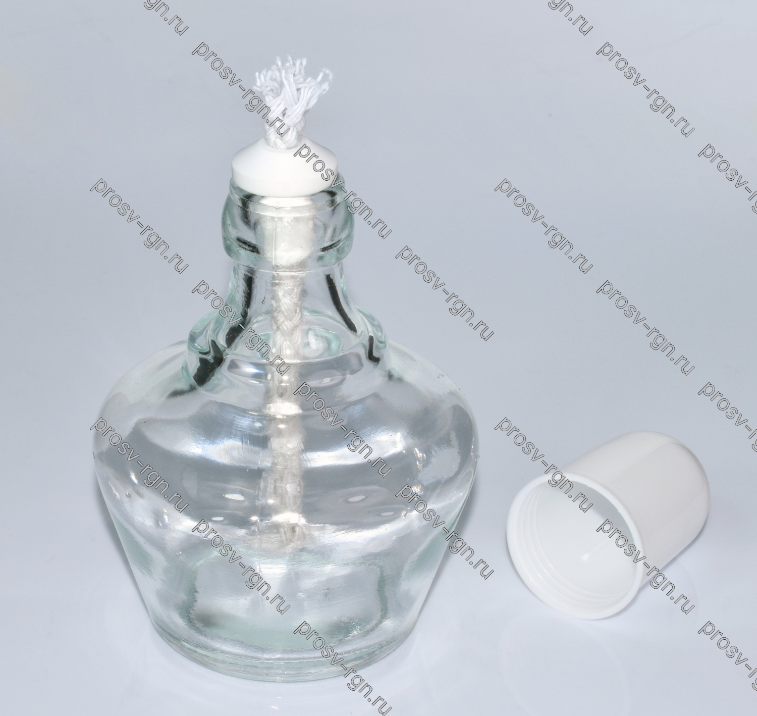 Спиртовка изготовлена из стекла, снабжена держателем фитиля и колпачком для гашения пламени.