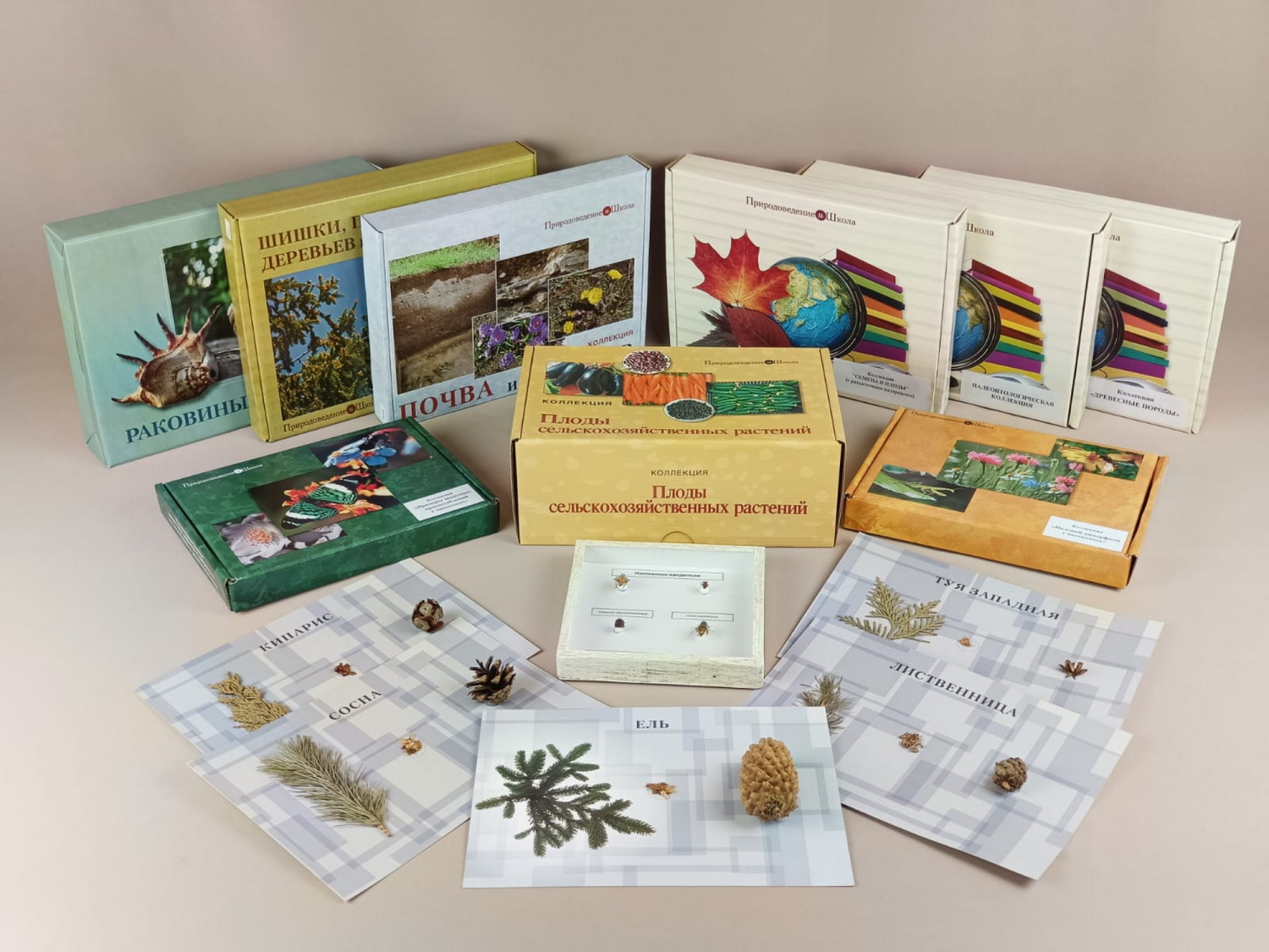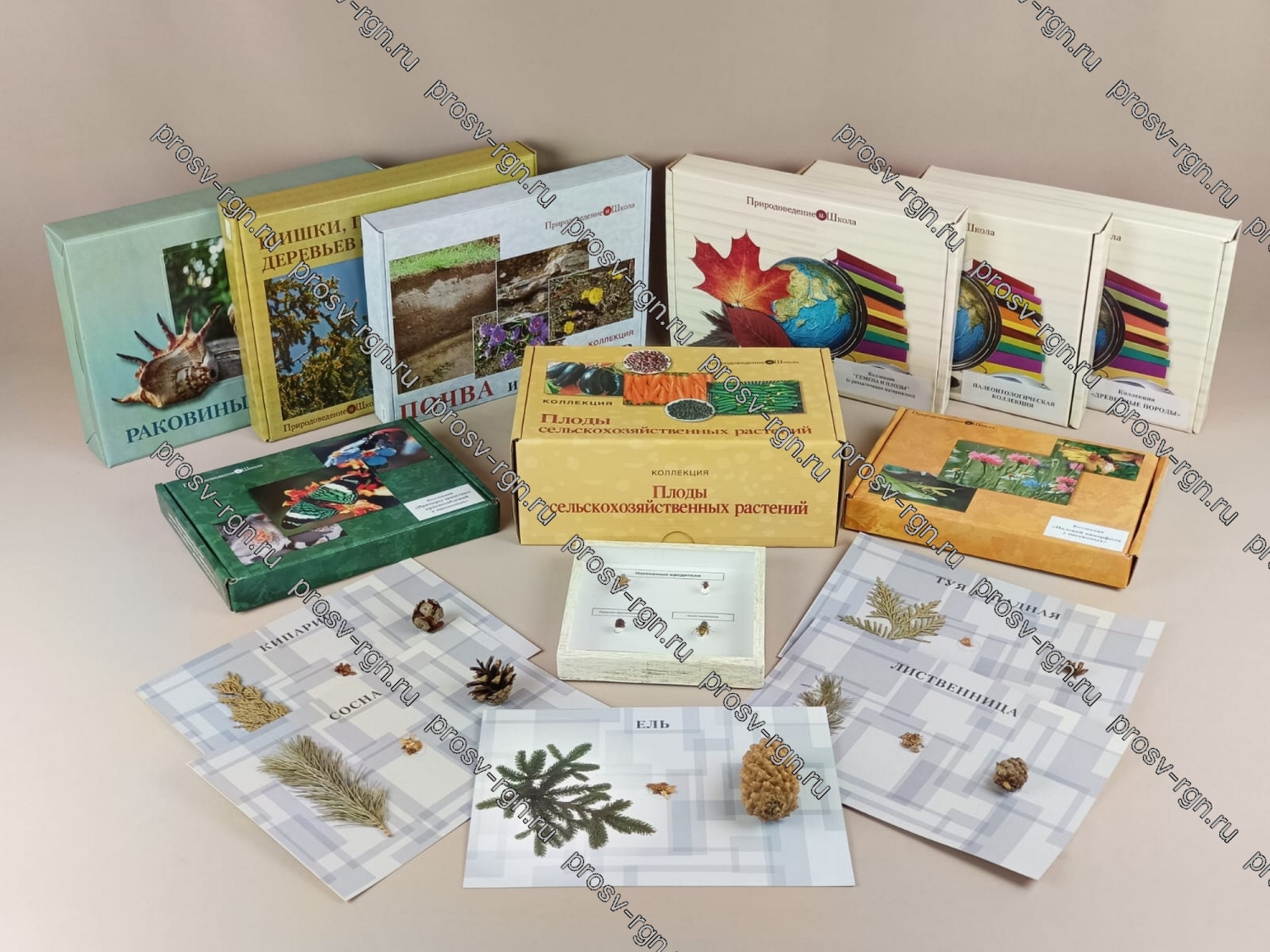 1) В коллекции "Голосеменные растения" представлены 5 видов голосеменных растений (ель, кипарис, лиственница, сосна, туя) в виде натуральных объектов – веток (ветка ели в виде рисунка), семян, шишек, наклеенных на 5 заламинированных планшетов размером 180х260 мм., с обратной стороны которых присутствуют цветные изображения представленного растения с пояснительным текстом. Коллекция упакована в коробку;