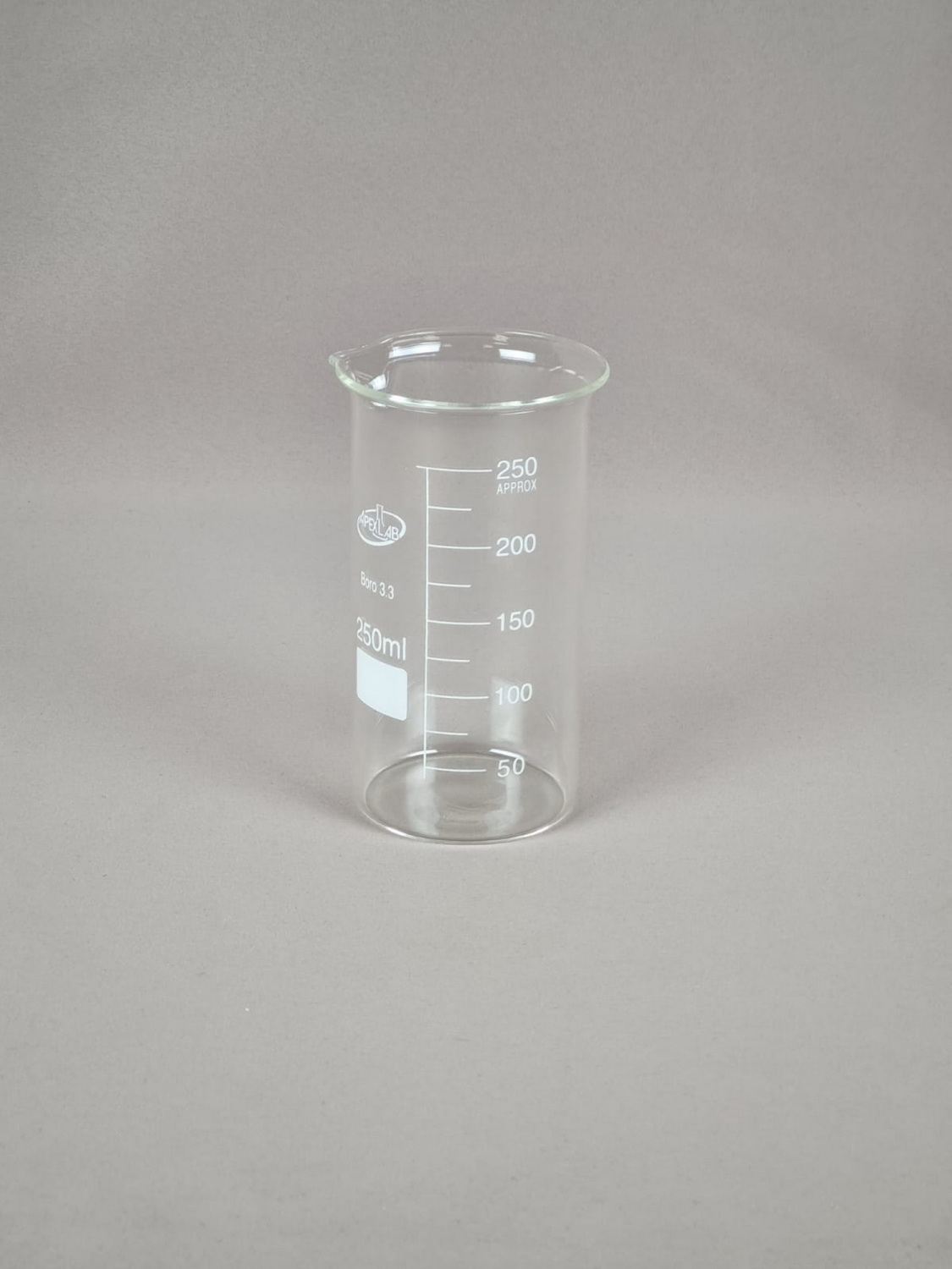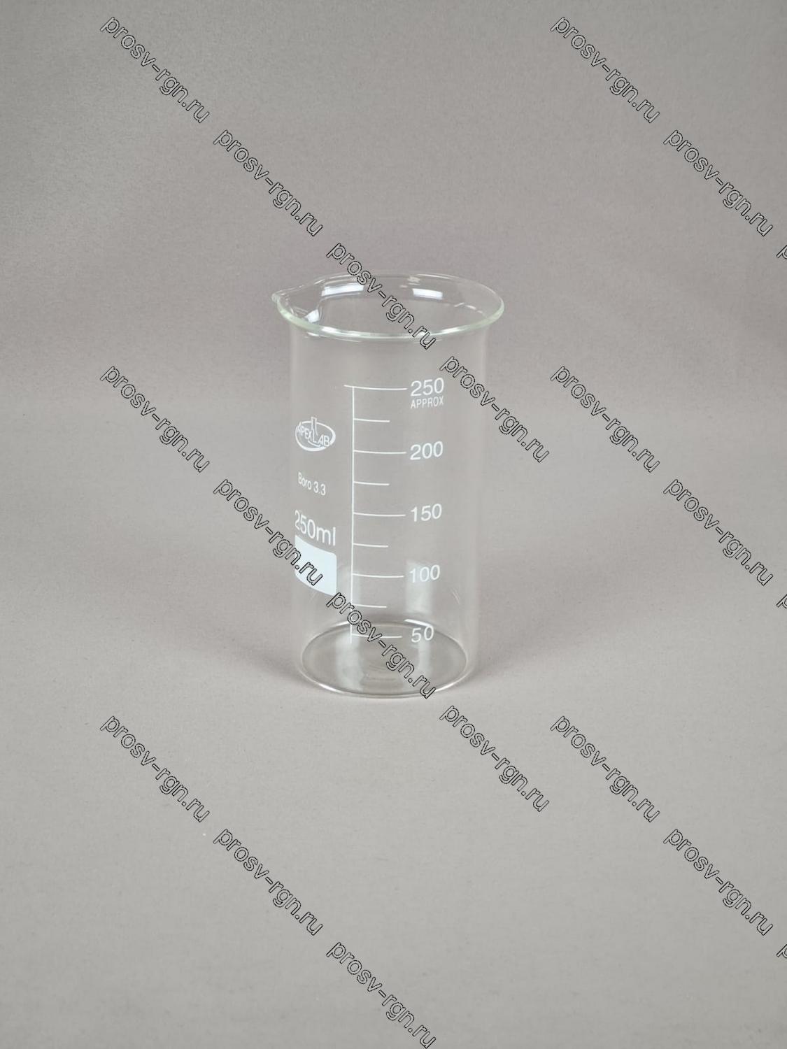 Предназначен для проведения различных аналитических работ, приготовления растворов, подогревания жидкостей, ориентировочного отмеривания жидкостей. Стакан со шкалой, означающей ориентировочную вместимость. Изготовлен из стекла. Объем 250 мл.
