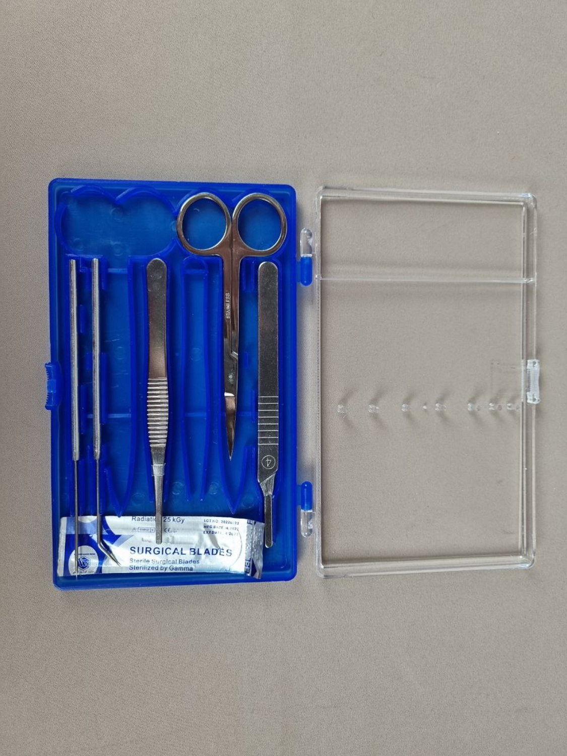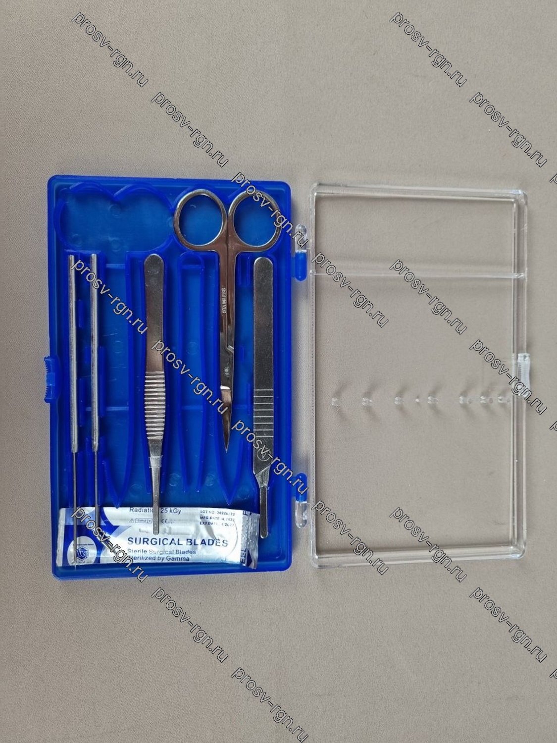 Комплектность: скальпель хирургический – 1 шт., ножницы – 1 шт., пинцет –1 шт., игла препаровальная прямая – 1 шт., игла препаровальная угловая – 1 шт.