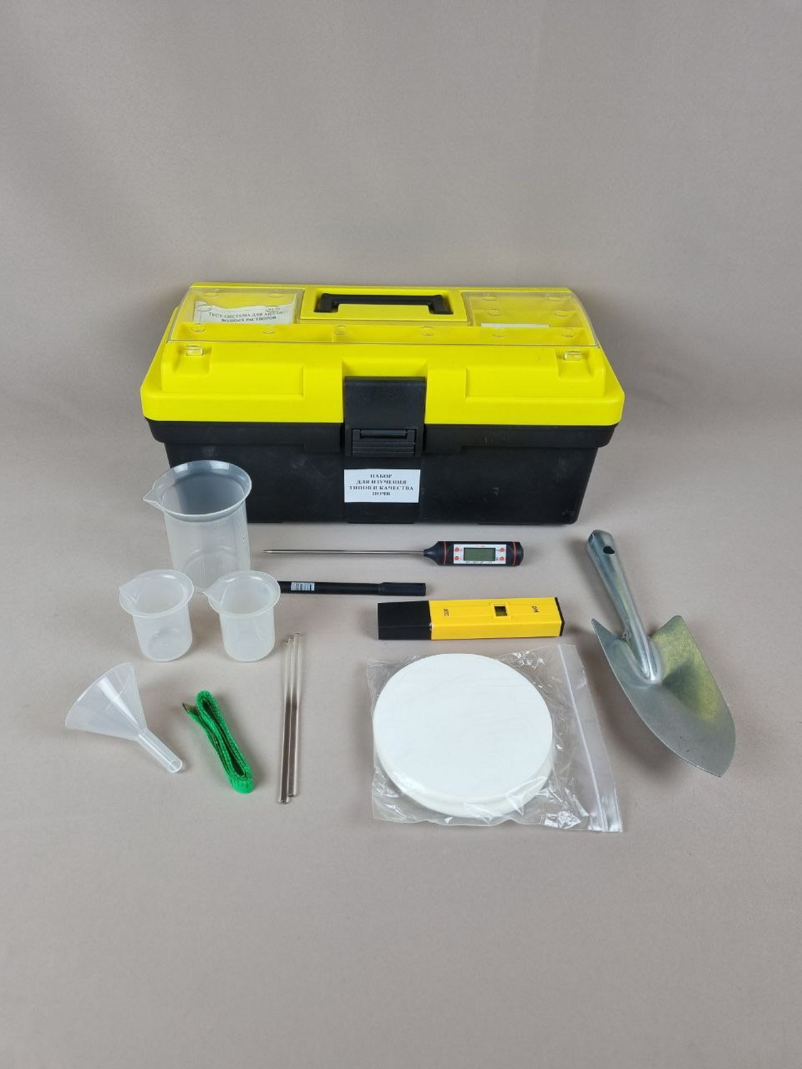 Набор предназначен для изучения типов и качества почв. Состав набора: термометр электронный со щупом – 1 шт., рН-метр электронный – 1 шт., тест-система "Нитраты" – 1 шт., совок металлический – 1 шт., пакеты-зип 150*200 мм – 10 шт., лента сантиметровая – 1 шт., стаканы мерные 50 мл – 2 шт., стакан мерный 250 мл – 1 шт., палочки стеклянные – 2 шт., воронка – 1 шт., фильтры обеззоленные "Синяя лента" – 1 уп., маркер перманентный – 1 шт., руководство по эксплуатации – 1 шт., пластиковый чемоданчик – 1 шт.