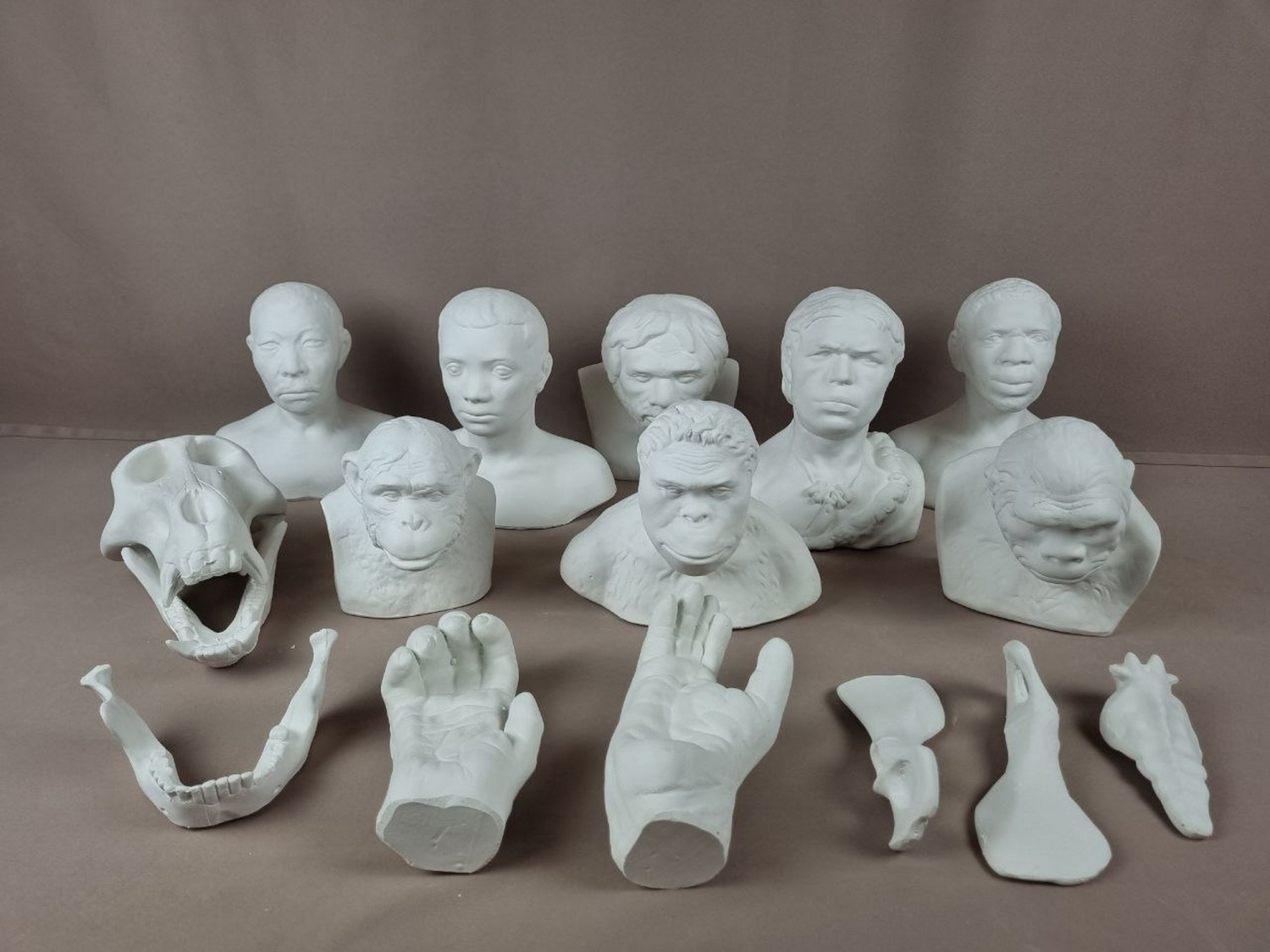 В состав набора включены следующие модели: 1. Бюст австралопитека – 1 шт.; 2. Бюст питекантропа – 1 шт.; 3. Бюст неандертальца – 1 шт.; 4. Бюст кроманьонца – 1 шт.; 5. Челюсть гейдельбергского человека – 1 шт.; 6. Череп павиана (с нижней челюстью) – 1 шт.; 7. Крестец и 2 тазовые кости орангутанга – 1 шт.; 8. Бюст шимпанзе – 1 шт.; 9. Кисть шимпанзе – 1 шт.; 10. Cтопа шимпанзе – 1 шт.; 11. Бюст представителя европеоидной расы – 1 шт.; 12. Бюст представителя негроидной расы – 1 шт.; 13. Бюст представителя монголоидной расы – 1 шт. Модели изготовлены из гипса.