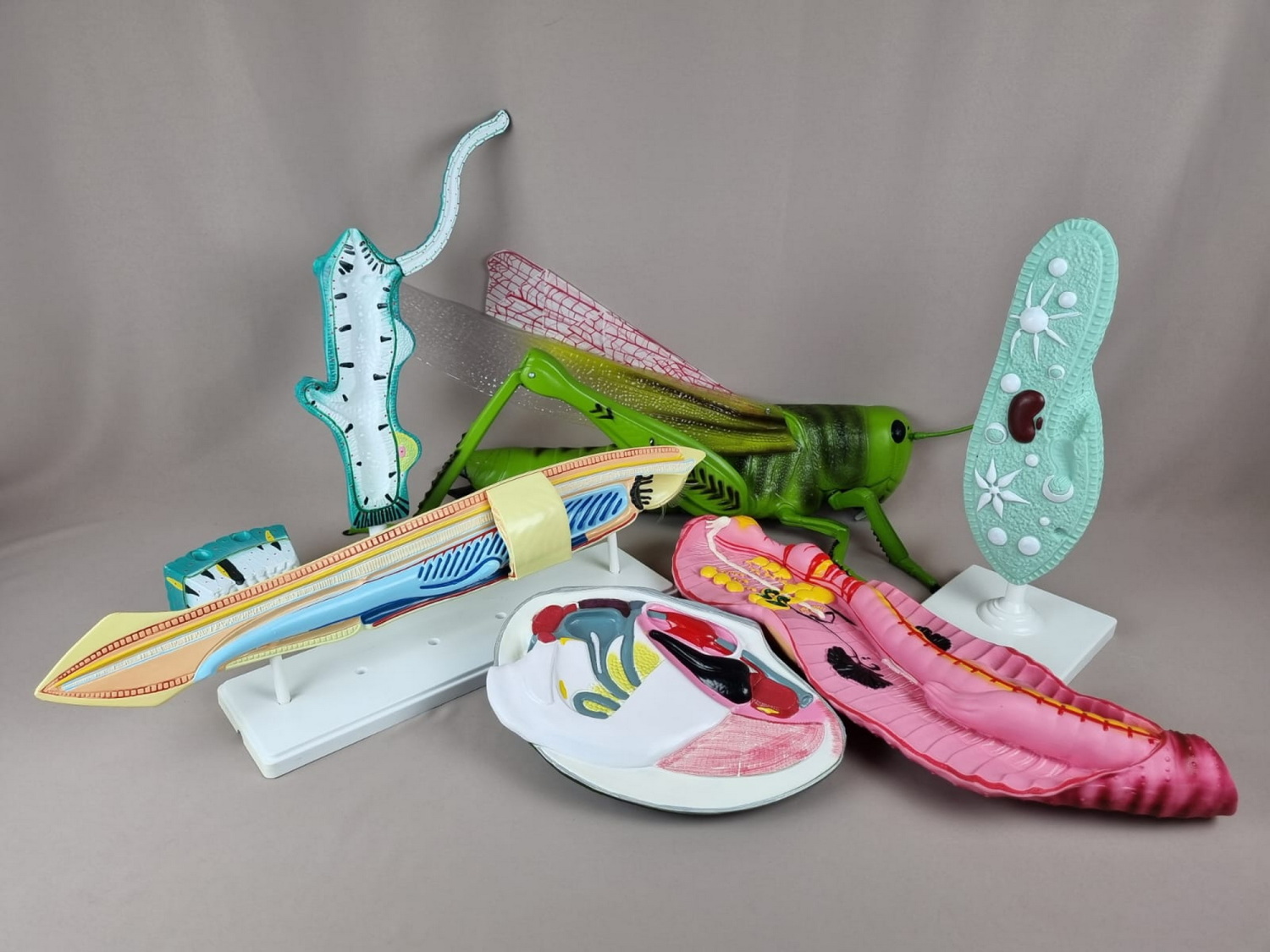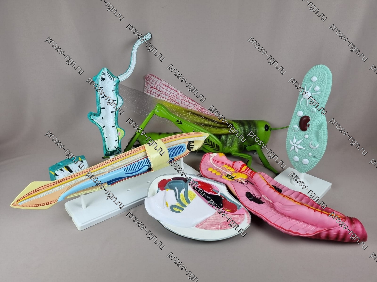 4) Модель "Кузнечик" предназначена для использования в общеобразовательных учреждениях на уроках биологии, в качестве демонстрационного пособия по разделу «Животные», к темам «Особенности строения насекомых» и «Типы развития насекомых». Модель разборная, изготовлена из пластмассы и раскрашена в естественные цвета. На модели представлены следующие детали строения насекомого: 1. Голова; 2. Верхняя губа; 3. Нижняя губа; 4.Усик; 5.Глотка; 6. Сложный глаз; 7. Глазок; 8. Ротовой аппарат; 9. Головной мозг; 10. Слюнные железы; 11. Крыло; 12. Надкрылье; 13. Брюшко; 14. Яичник; 15. Яйцеводы парные; 16. Семяприемник; 17. Пищевод; 18. Желудок; 19. Яйцеклад; 20. Кишечник; 21.Передняя грудь; 22. Трахеи; 23. Задняя грудь; 24. Окологлоточный нервный узел; 25. Средняя грудь; 26. Дыхальца; 27. Брюшная нервная цепочка; 28. Аорта; 29. Сердце; 30. Передняя нога; 31. Средняя нога; 32. Задняя нога; 33. Орган слуха; 34.Шипики на ногах; 35. Прямая кишка; 36. Анальное отверстие.;
