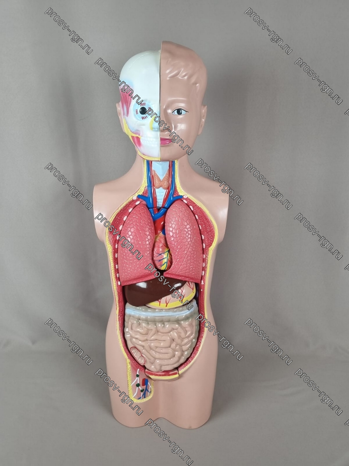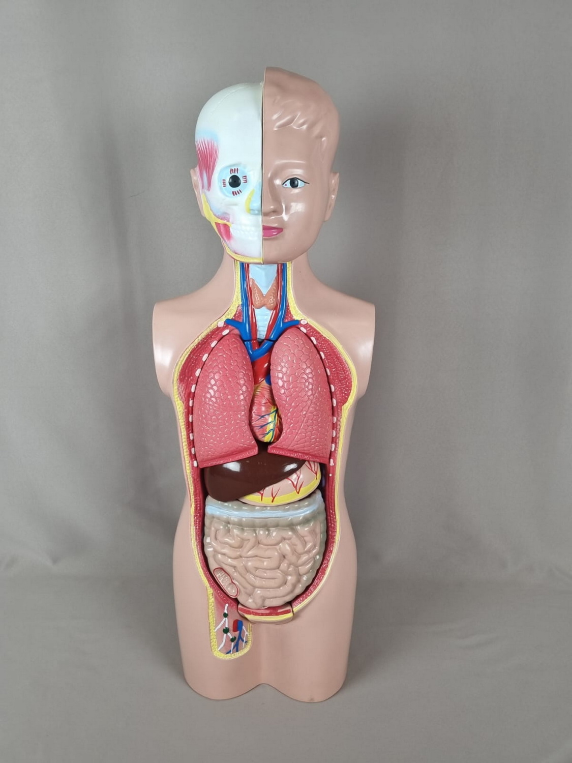 Модель представляет собой объемный, разборный муляж торса человека и состоит из следующих съемных частей: полость торса, передняя грудная стенка с частью легкого, диафрагма, печень с желчным пузырем, желудок, кишечник, сердце. Съемные детали легко крепятся к основе и снимаются с нее. Модель дает возможность достоверно и наглядно показать конфигурацию органов брюшной и грудной полостей, а также их взаиморасположение. На модели представлены внутренние органы человека без детализации вхождения нервов, сосудов, а также способов фиксации органов в живом организме. Применено цветовое кодирование с целью выделению нужных структур. Окраска всех органов близка к естественной. При окрашивании кровеносных сосудов применяется общепринятое в анатомии цветовое кодирование - синим и красным цветом.