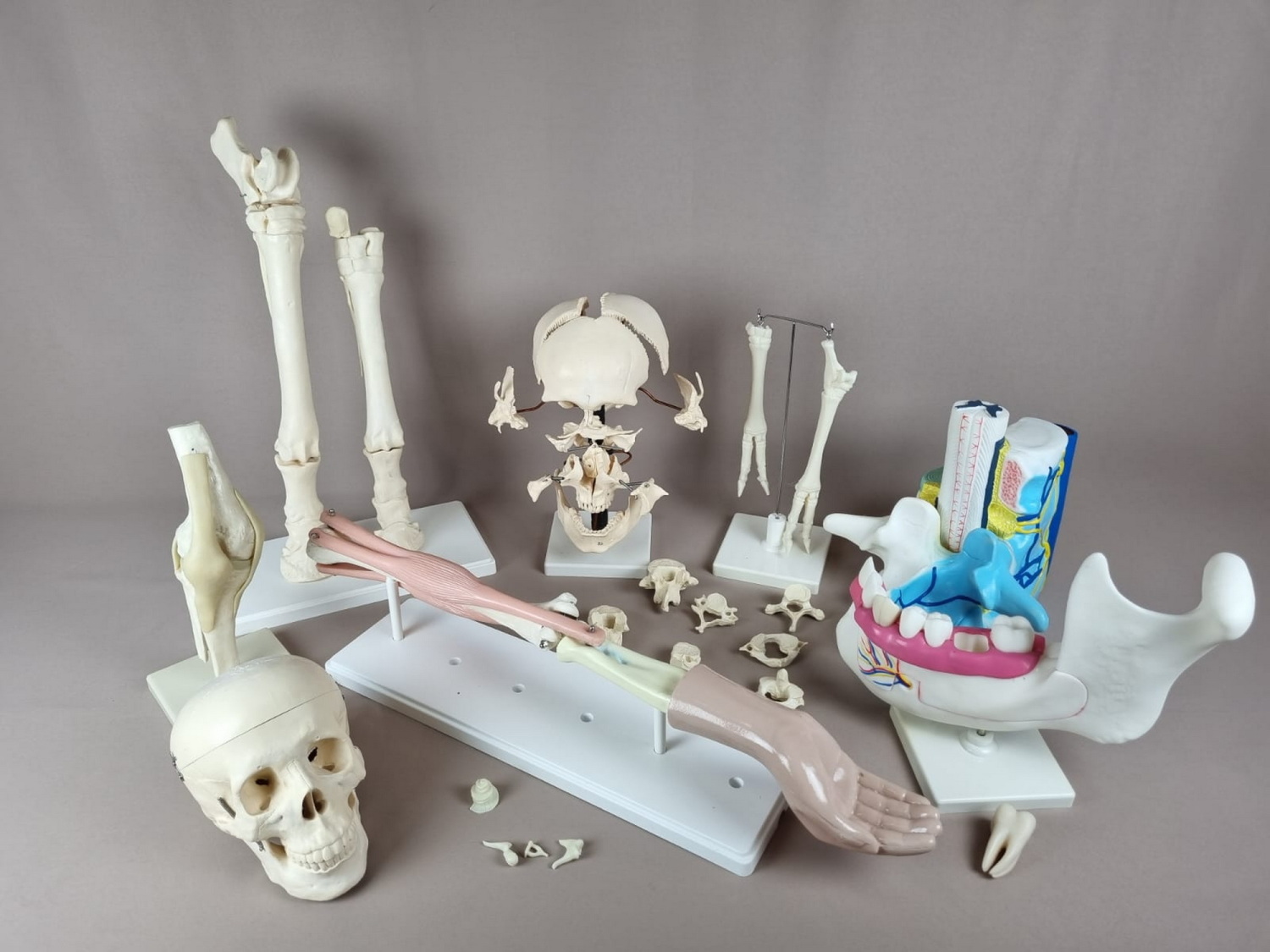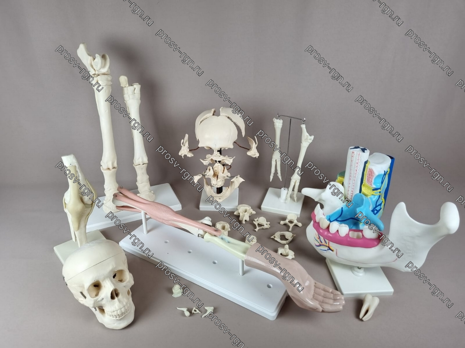 1) Модель "Челюсть разборная" предназначена для использования в общеобразовательных учреждениях на уроках биологии, в качестве демонстрационного пособия по разделу «Человек и его здоровье», темам « Опорно-двигательная система. Скелет головы» и «Пищеварительная система. Строение и расположение зубов». Модель разборная, представляет собой увеличенный образец нижней челюсти с зубами. Изготовлена из пластмассы, раскрашена в естественные цвета и установлена на подставку. Модель отображает строение части нижней челюсти человека, расположение на ней зубов, с подходящими к ним кровеносными сосудами и нервами, типы и конфигурацию зубов человека, а так же их внутреннее строение; 2) Модель "Коленный сустав" предназначена для использования в общеобразовательных учреждениях на уроках биологии, в качестве демонстрационной модели по разделу «Человек и его здоровье», к теме «Опорно-двигательная система». Модель представляет собой выполненную в натуральную величину функциональную модель коленного сустава, на которой выделены бедренная и большая берцовая кости, наружная и внутренняя связки, мениск и связка надколенника; 3) Модель "Локтевой сустав" предназначена для использования в общеобразовательных учреждениях на уроках биологии, в качестве демонстрационной модели по разделу «Человек и его здоровье», к теме «Опорно-двигательная система». Модель представляет собой верхнюю конечность человека. Модель устанавливается на подставку, кости скелета модели изготовлены из пластмассы, а мышцы - из резины. На модели возможность рассмотреть следующие детали строения локтевого сустава: 1. Кисть; 2. Плечевая кость; 3. Локтевая кость; 4. Мышца-сгибатель (двуглавая мышца); 5. Лучевая кость; 6. Мышца- разгибатель (трехглавая мышца); 4) Модель "Кости черепа" изготовлена из пластмассы, выполнена с анатомической точностью и состоит из 15 костей. Отдельные кости черепа прикреплены к шпилькам и установлены на круглой подставке; 5) Модель "Косточки слуховые" предназначена для использования в общеобразовательных учреждениях на уроках биологии, в качестве демонстрационного и раздаточного материала в разделе «Человек и его здоровье», по теме «Ухо и его функция. Слуховое восприятие». Изготовлена из пластмассы. В комплекте представлены увеличенные слуховые косточки: молоточек, наковальня, стремечко и улитка. Улитка помещена в полупрозрачный пластмассовый чехол.;
