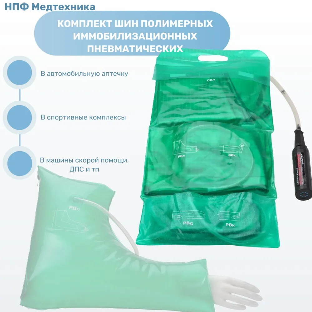 Шины иммобилизационные пневматические применяются при подозрении на переломы костей голени, стопы, предплечья, повреждение локтевого и коленного суставов включительно, при повреждении мягких тканей конечностей с наружным кровотечением для создания неподвижности (иммобилизации) поврежденных конечностей на время транспортирования с места получения травмы до лечебного учреждения.