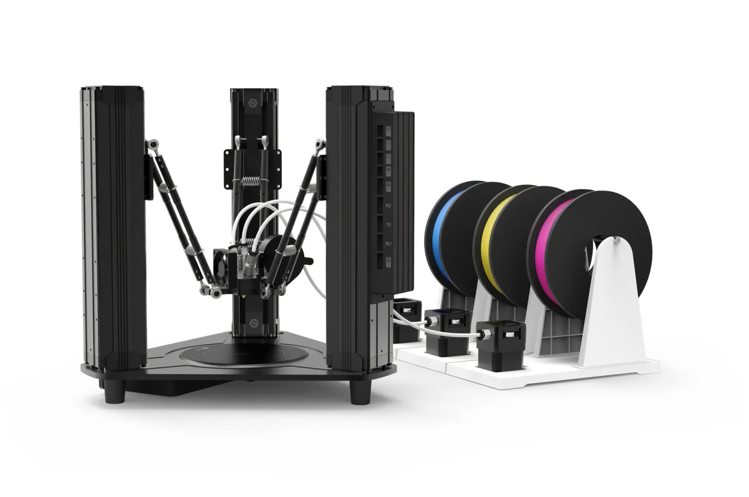 Современный 3D-принтер с дельта-кинематикой. Комбинированная головка для печати позволяет осуществлять многоцветную печать, получая необычные модели и даже готовые изделия с высокой скоростью и точностью. Вы можете применять наиболее распространенные цветовые палитры RGB и CMYK для получения любых оттенков из пластика.