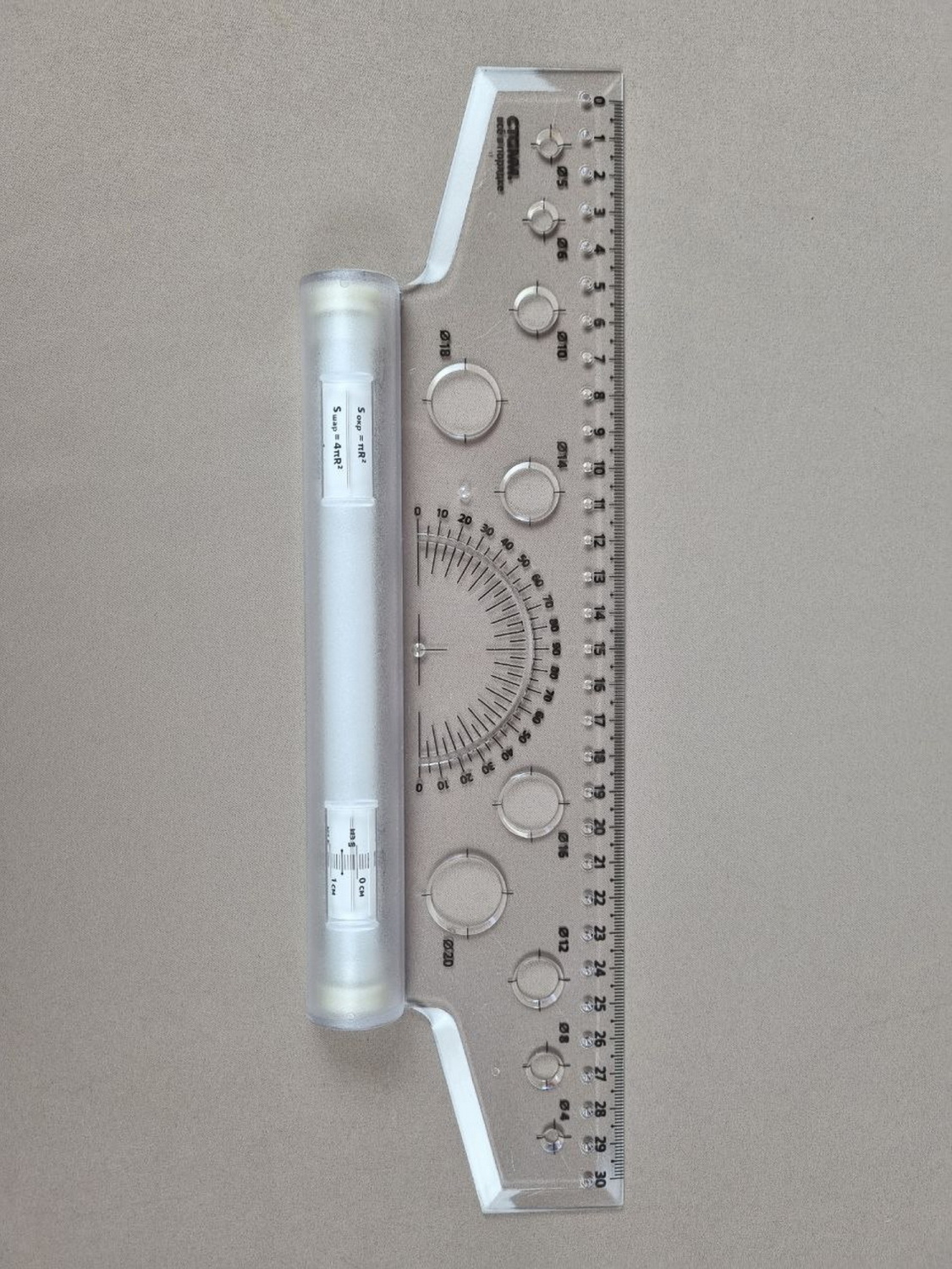 Длина линейки не менее 30 см. Материал изготовления линейки – пластик. Линейка оснащена металлическим антискользящим роликом.
