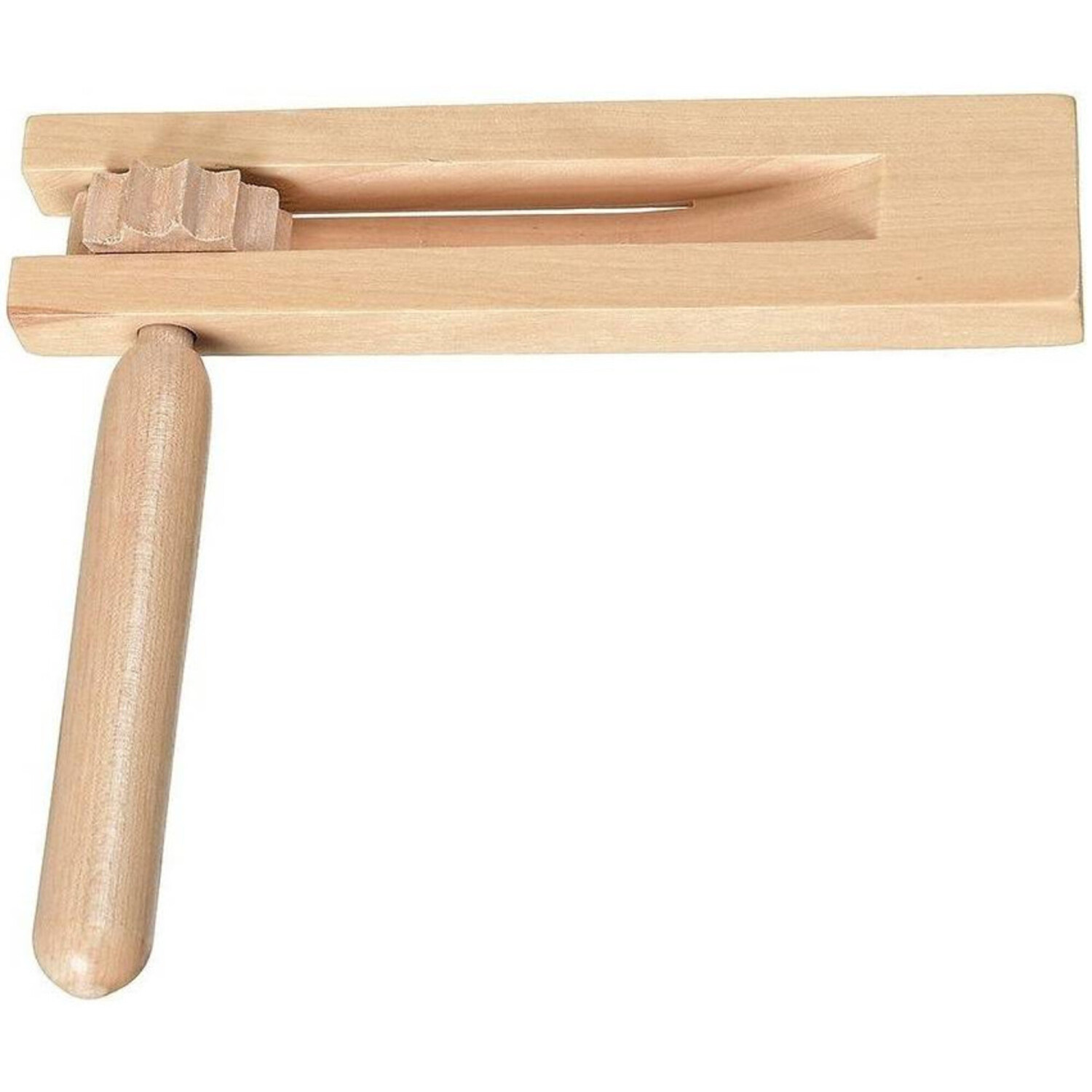 Трещотка представляет собой прямоугольную пластину с выемками, в которые помещена шестеренка, прикрепленная к удобной ручке.